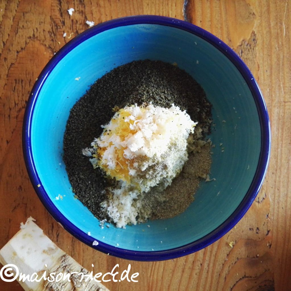 Die geriebene Zitrusschale, den Meerrettich, die abgekühlten Brennnesselsamen, den Honig und ca. 1 TL Kräutersalz dazu geben. Alle Zutaten gut miteinander vermischen und abschmecken.