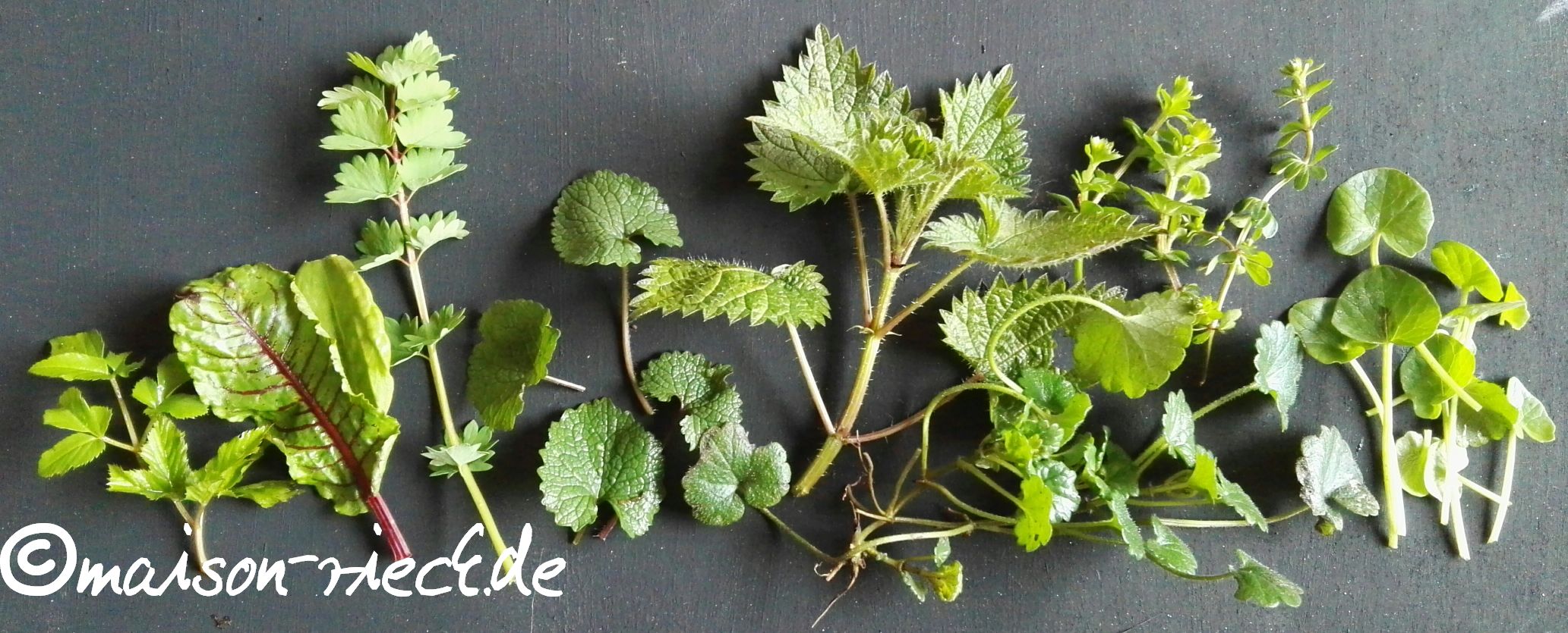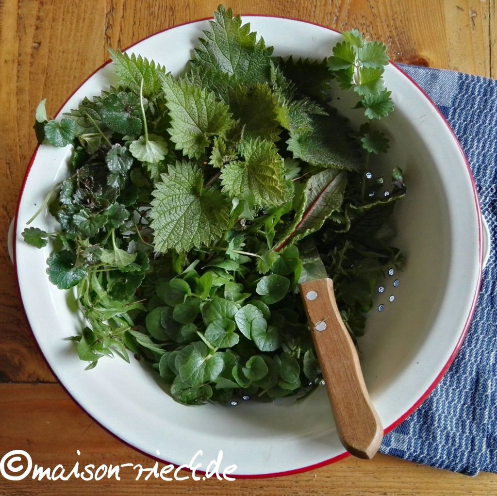 100 g junge Wildkräuter (Blätter und Triebspitzen), insbesondere Giersch, Gundermann, Scharbockskraut, Sauerampfer, Löwenzahn, Brennnessel, Pimpinelle, Wiesenlabkraut, Knoblauchrauke, Vogelmiere und Spitzwegerich