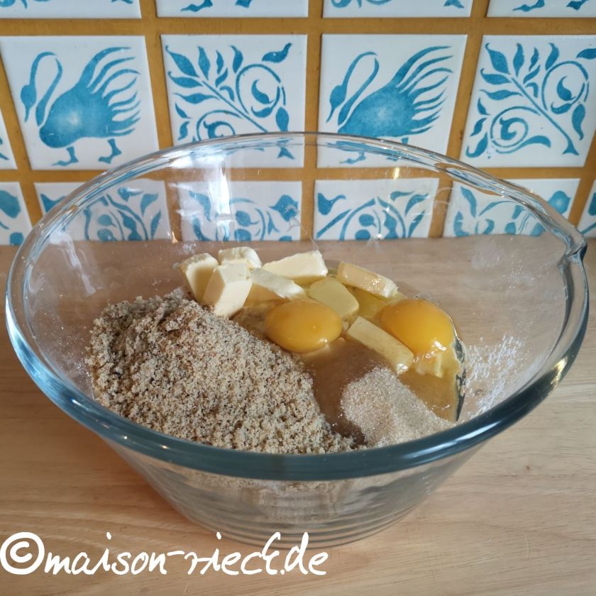 Entweder mit den Knethaken des Handmixers oder direkt mit den Händen alle Zutaten miteinander verkneten bis ein geschmeidiger Mürbteig entsteht. Den Teig zu einer Kugel kneten und in einer abgedeckten Schüssel ca. 1 Stunde kühl stellen.