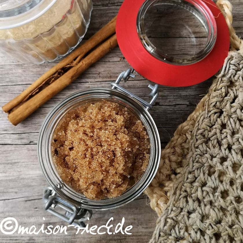 Das Zimt & Zucker-Peeling ist mehrere Monate haltbar, wenn es nicht zu warm gelagert wird. Wasser sollte nicht in das Aufbewahrungs-Gefäß gelangen, weil der Zucker sonst klumpt.