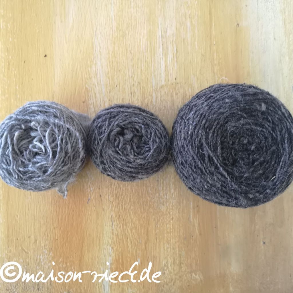 Um bei dem gewebten Tuch einen Farbverlauf von hell zu dunkel zu erhalten, habe ich für das erste Drittel helles Garn genommen, für das zweite Drittel mittelgraues und für das letzte Drittel dunkelgraues.