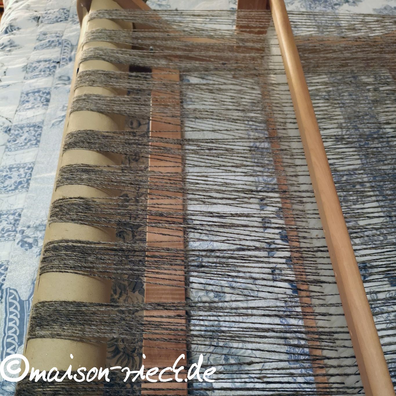 Gewebt wurde dann ebenfalls zuerst mit hellem Grau, dann nach und nach mit dunkler werdendem Schussfaden. Am Ende der Kettfäden angekommen habe ich den Rand des Stoffes mit einem Saum-Stich fixiert. Dann konnten die Kettfäden abgeschnitten werden.