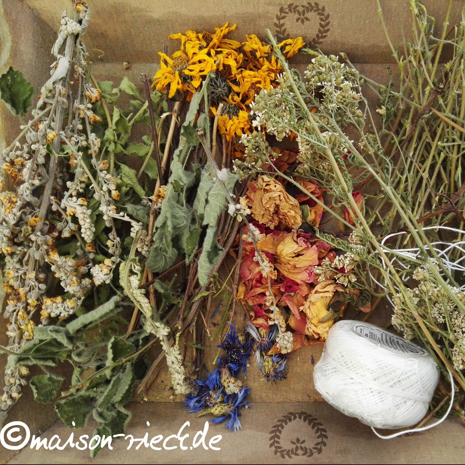 Die getrockneten Zweige in einer Hand parallel zu einem Bündel legen. Die Blüten und lose Blätter dazwischen legen. Dann das Bündel mit dem Baumwollgarn von einem Ende zum anderen und wieder zurück fest umwickeln. Den Anfang des Garns mit dem Ende verknoten und dann abschneiden.