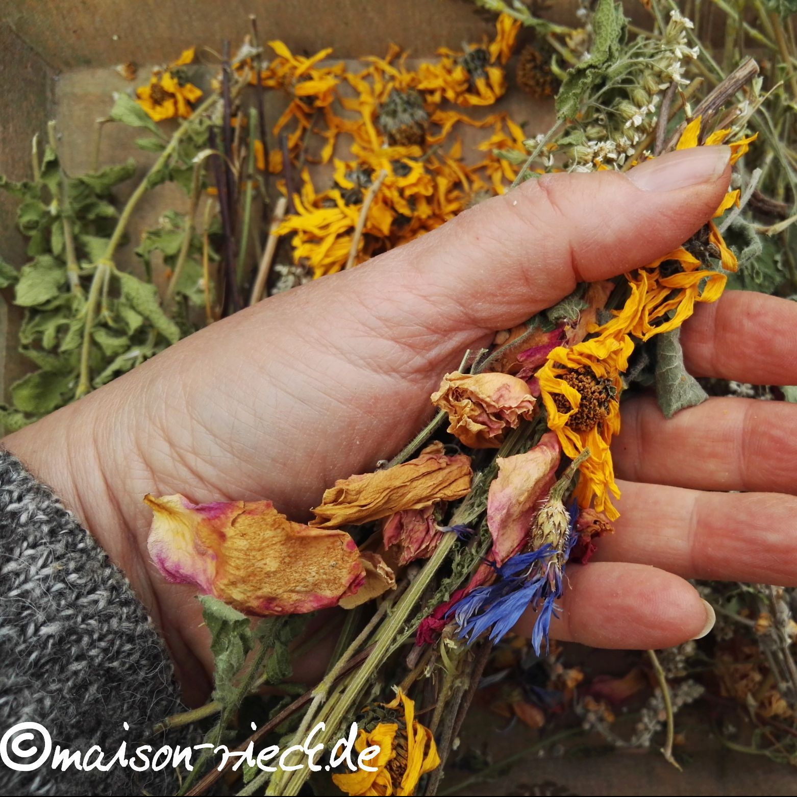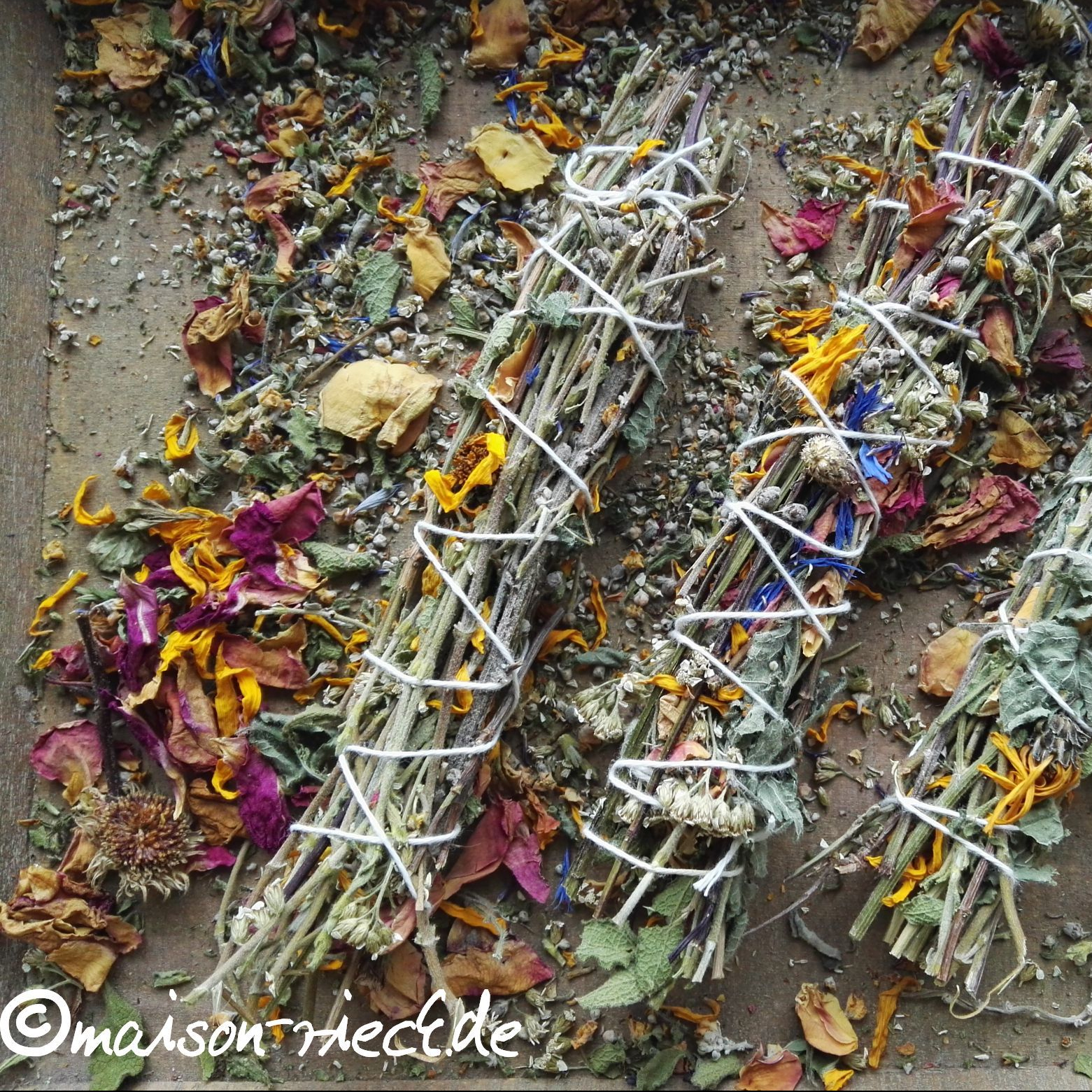 - getrocknete Zweige, Harze und Blüten (Beispiele siehe oben; bitte nur Pflanzen verwenden, die sicher bestimmt wurden und nicht giftig sind).
