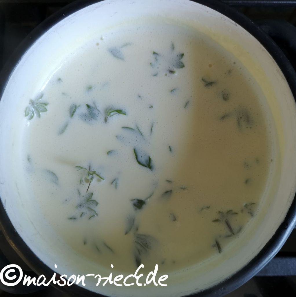 Dann in einem kleinen Topf die Sahne mit der Milch und den gewelkten Waldmeister-Stängeln aufkochen und ca. 5 min köcheln lassen. Den Topf von der Kochstelle nehmen und den Waldmeister ca. 1/2 Std. ziehen lassen. Anschließend die Sahne durch ein Sieb gießen und die Pflanzenteile herausfiltern (es sollten etwa 200 g aromatisierte Sahne übrig bleiben).