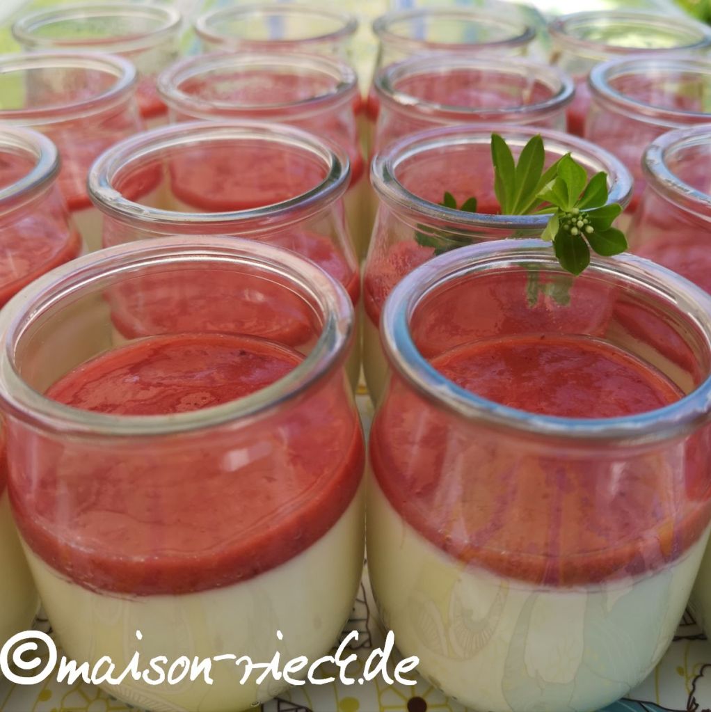 Die Panna Cotta am besten in kleine Portionsgläser füllen (zum Beispiel Weckgläser oder auch Joghurt-Gläser) und 2-4 Stunden im Kühlschrank fest werden lassen. Während dieser Zeit am besten mit einem Brettchen abdecken.