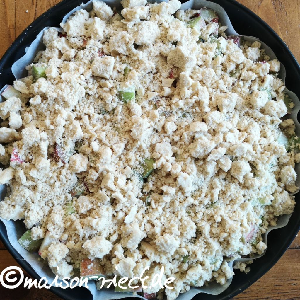 In diesem einfachen Rezept sind die Streusel sowohl auf als auch unter dem Rhabarber. Dazu wird einfach die doppelte Menge des Streusel-Teigs hergestellt. Die eine Hälfte wird als Boden in eine Springform gedrückt, die andere auf dem klein geschnittenen Rhabarber verteilt.