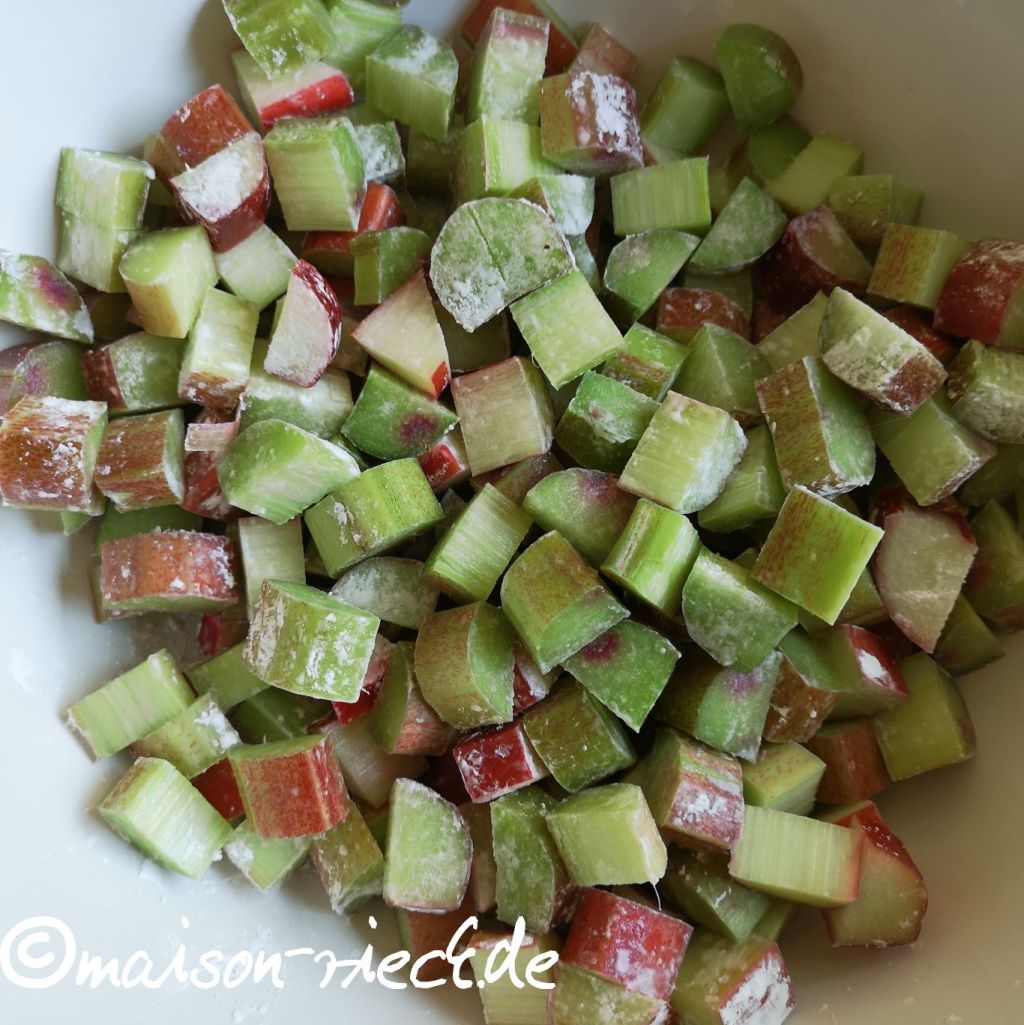 Die Rhabarberstiele waschen, je nach Größe längs halbieren und dann in ca. 1 cm dicke Scheiben schneiden. Die Rhabarber-Stücke mit der Speisestärke vermischen und auf dem Streusel-Boden verteilen.