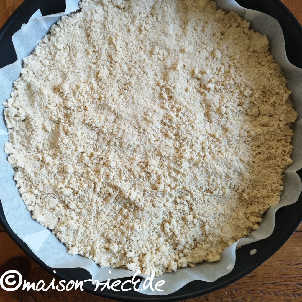 Die Hälfte der Streusel als Boden in der mit Backpapier ausgelegten Springform verteilen.