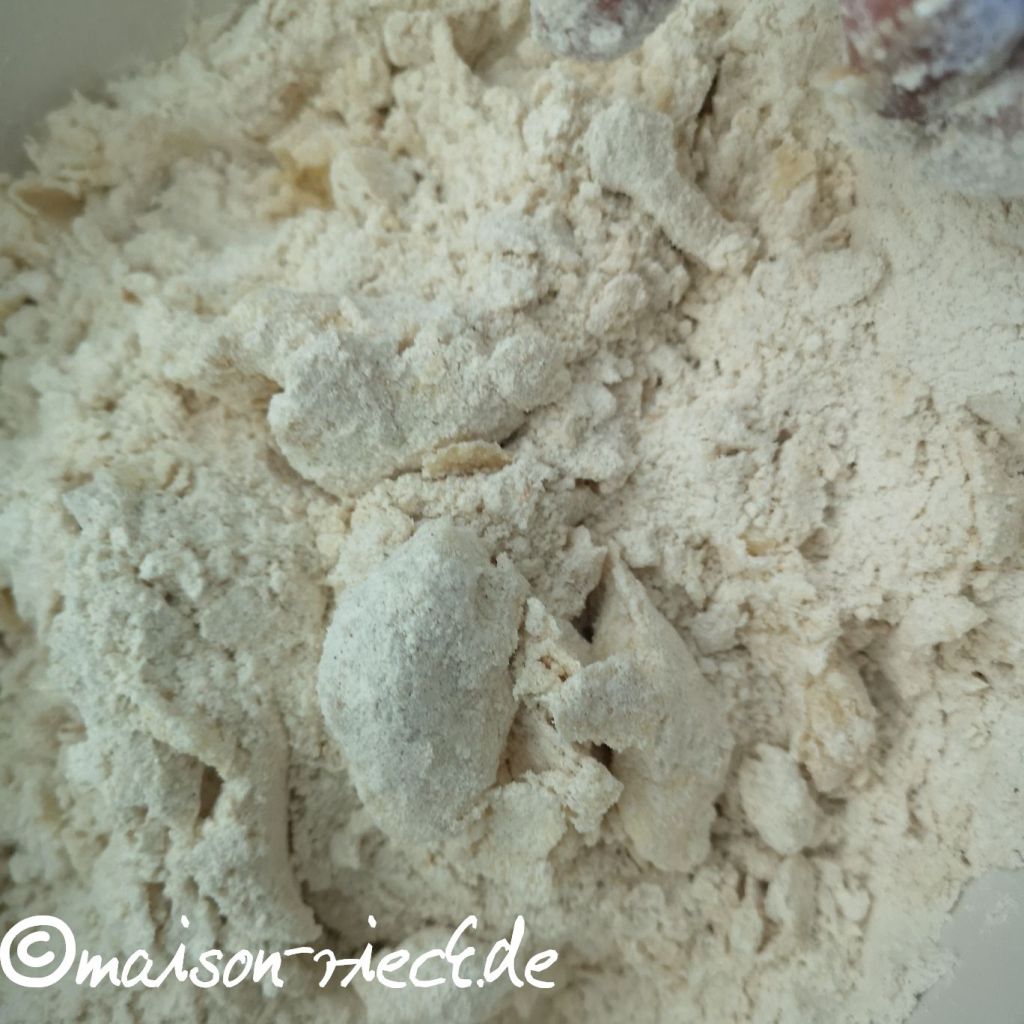 Für die Streusel erst alle trockenen Zutaten in einer Schüssel gut mischen. Dann die Butter in kleine Stücke schneiden und in der Mehlmischung verteilen. Die Butterstücke mit den Händen zu krümeligen Streuseln verreiben.