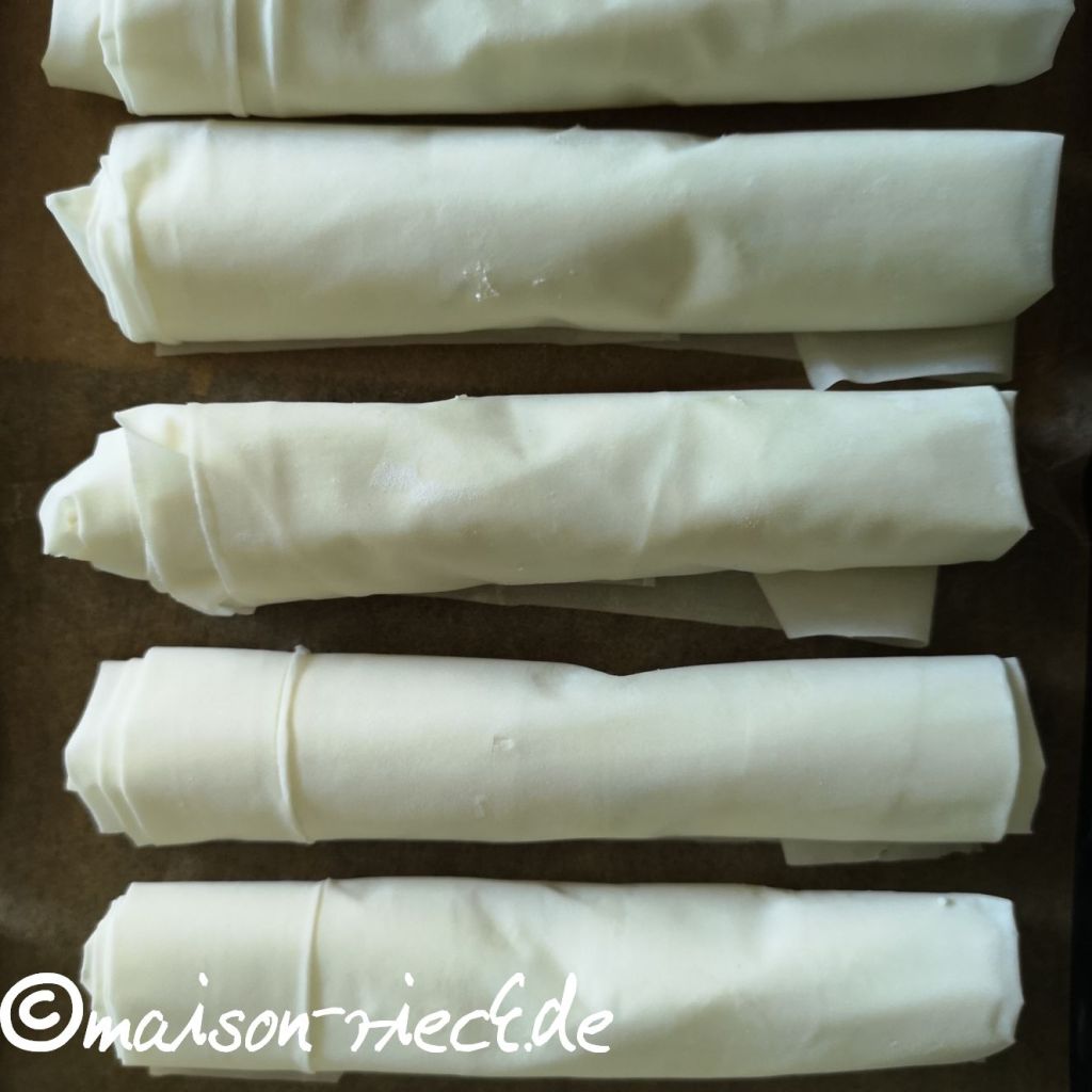 Die beiden Seiten des Yufka-Dreiecks über die Füllung schlagen, dann zur Spitze hin aufrollen. Mit der offenen Seite nach unten auf ein mit Backpapier ausgelegtes Backblech legen. Mit Olivenöl bepinseln.