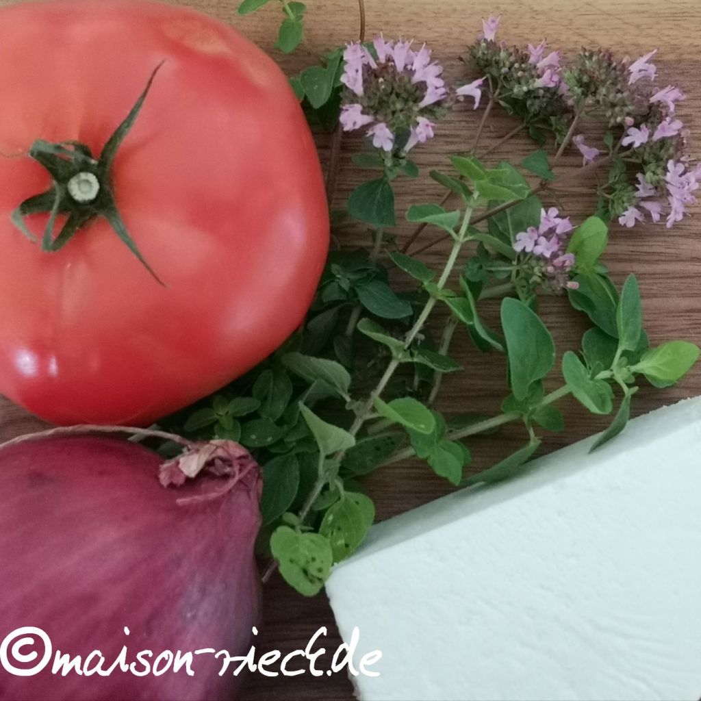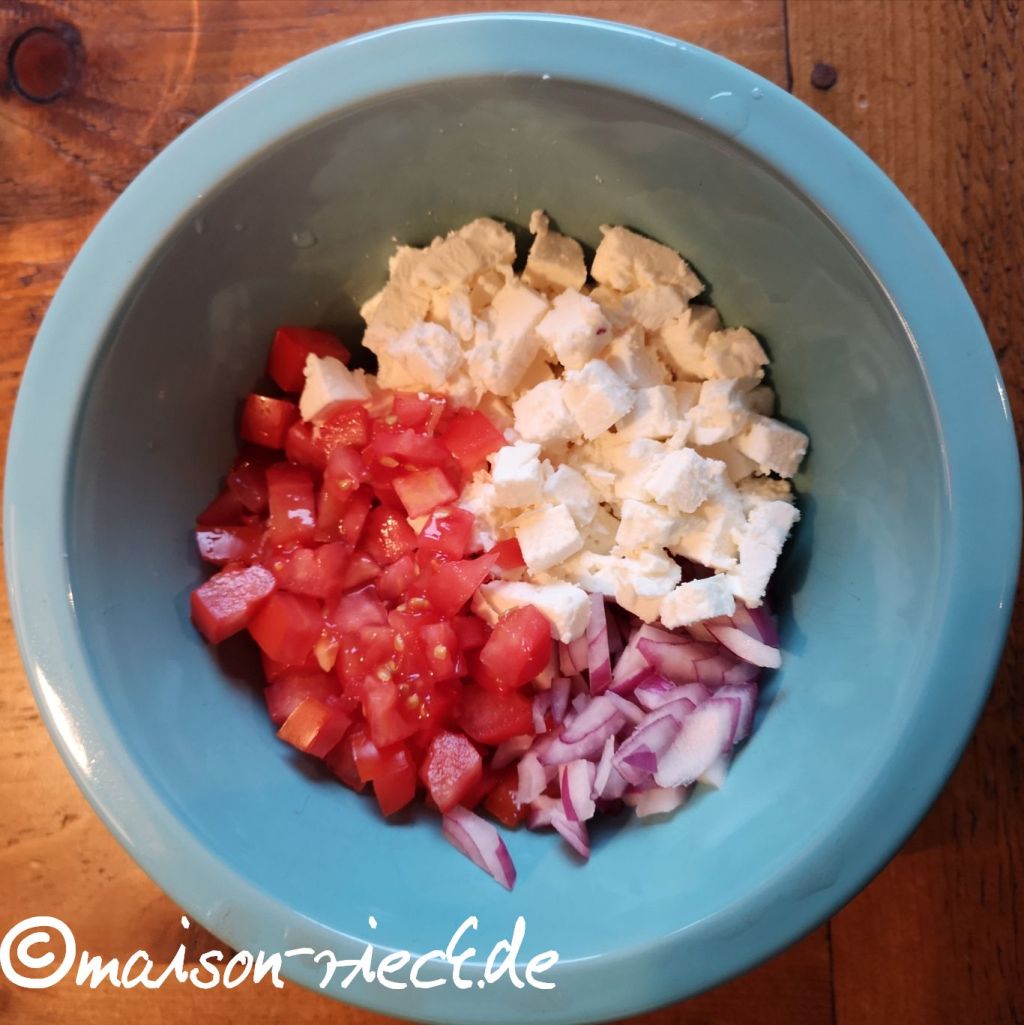 Die Fleischtomaten zuerst in Scheiben und dann in Streifen und kleine Würfel schneiden. Dabei den Stielansatz entfernen. Den Feta und die rote Zwiebel ebenfalls klein würfeln. Alle drei Zutaten in eine Schüssel geben und vorsichtig mischen.