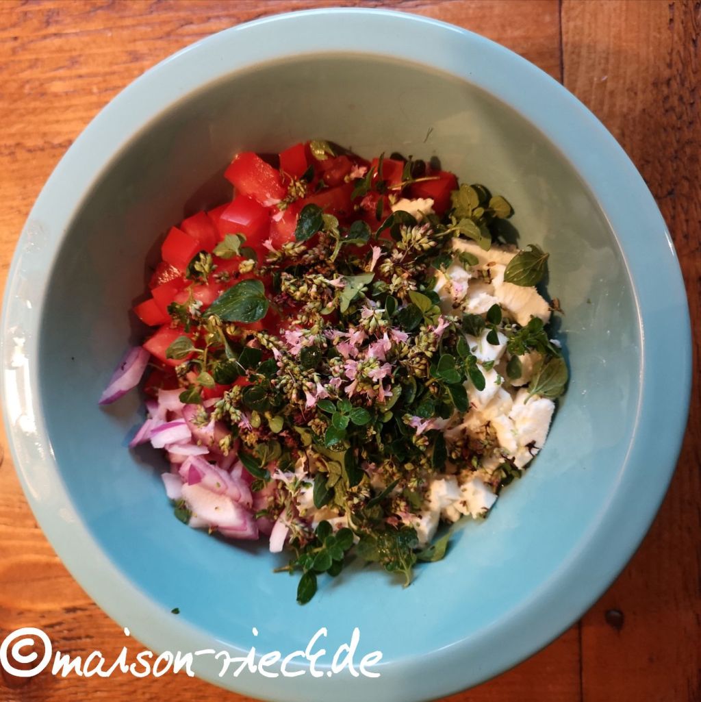 Den Saft der Zitrone, das Olivenöl und etwas Salz dazugeben. Die Dost-Blättchen und -Blüten von den Zweigen zupfen und mit den anderen Zutaten erneut mischen. Am besten eine Stunde im Kühlschrank ziehen lassen, bevor der Salat als kleine Vorspeise (Mäsa) serviert wird.