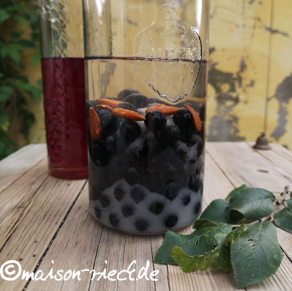 In diesem Rezept werden außer ein wenig Zucker auch ein paar Mandeln zugesetzt. Das verstärkt den leichten Bittermandelgeschmack, den auch die Schlehenkerne abgeben.