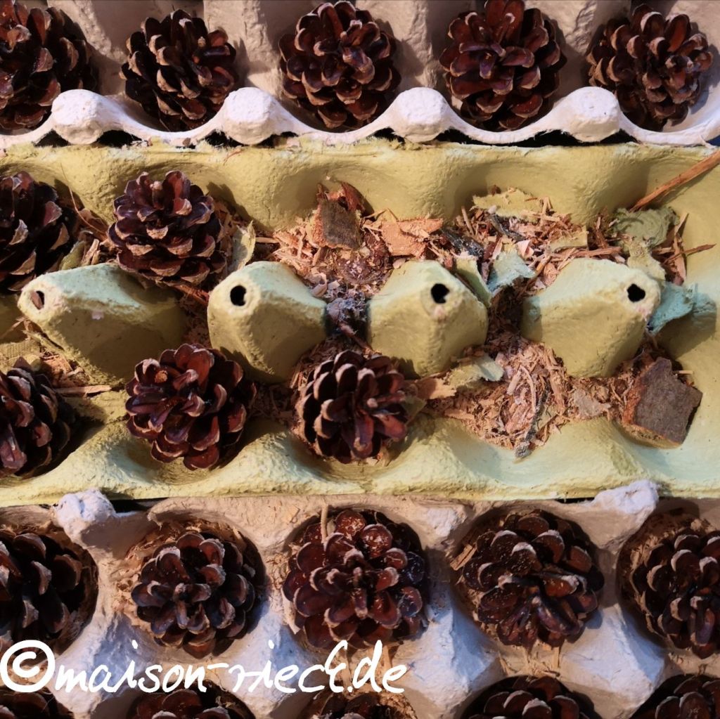 Nach dem Abkühlen abwarten, bis das Wachs richtig hart geworden ist und die Kiefernzapfen fest in den Eierkarton-Vertiefungen sitzen.