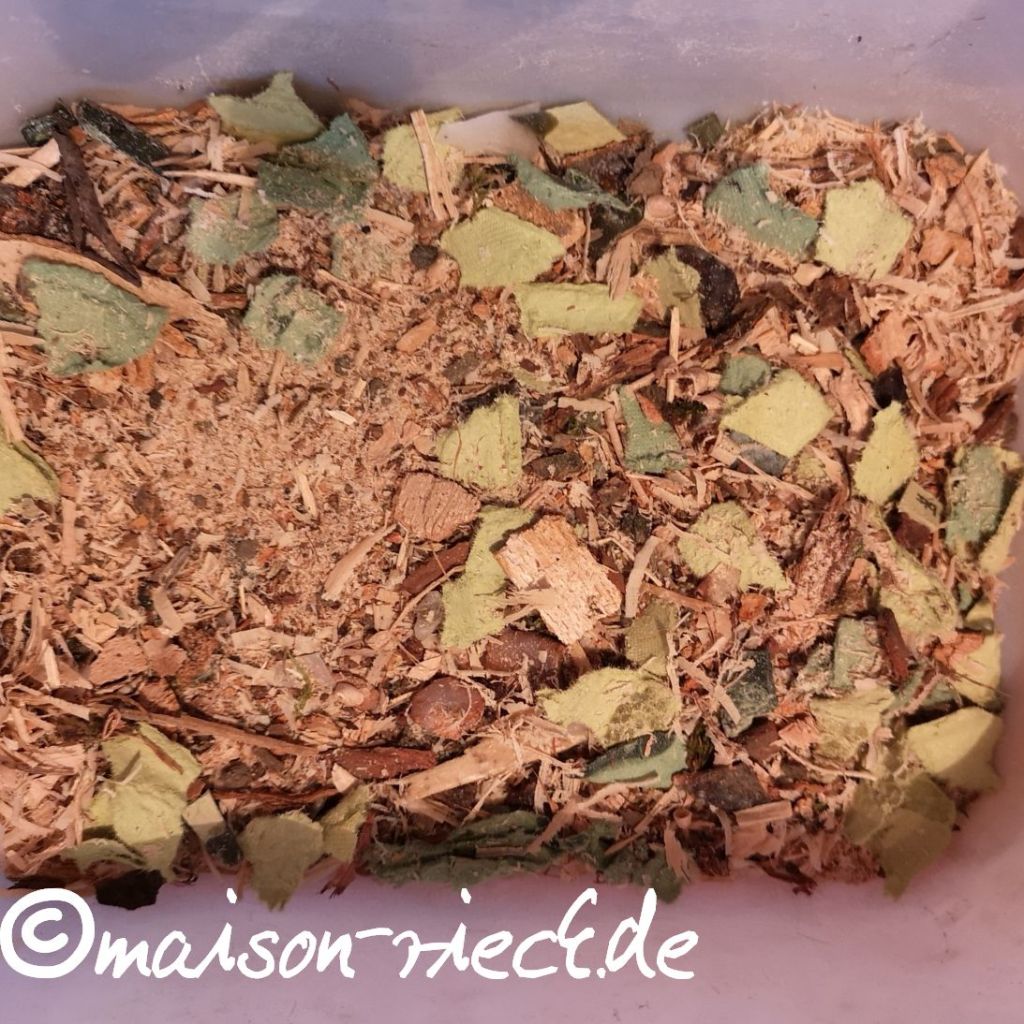 Mit der Schere die Deckel vom Unterteil abschneiden. Die Unterteile auf ein mit Backpapier ausgelegtes Backblech stellen. Dann die Deckel in kleine Schnipsel schneiden oder reißen. Wer Holzspäne hat, braucht nicht alle Deckel kleinzumachen, sondern mischt Späne und Schnipsel. Von dieser Mischung wird ca. 1 cm hoch etwas in die Vertiefungen im unteren Teil der Eierkartons gefüllt.