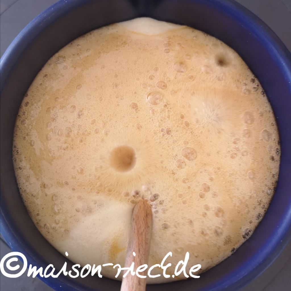 Die Teigplatte an einem warmen Ort mehrere Stunden oder auch über Nacht ruhen lassen.