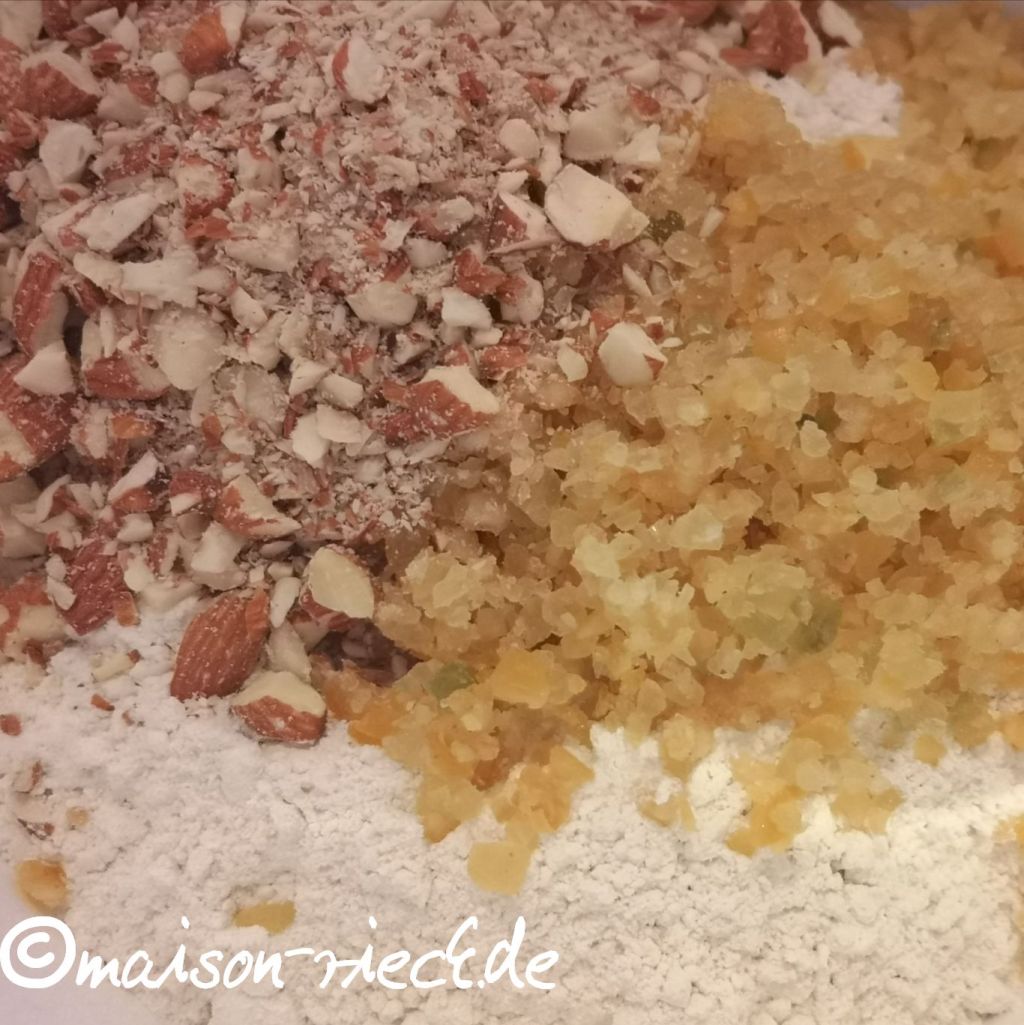 Das Mehl in einer großen Schüssel mit dem Backpulver und den gehackten Mandeln mischen. Zitronat und Orangeat fein hacken und dazugeben.