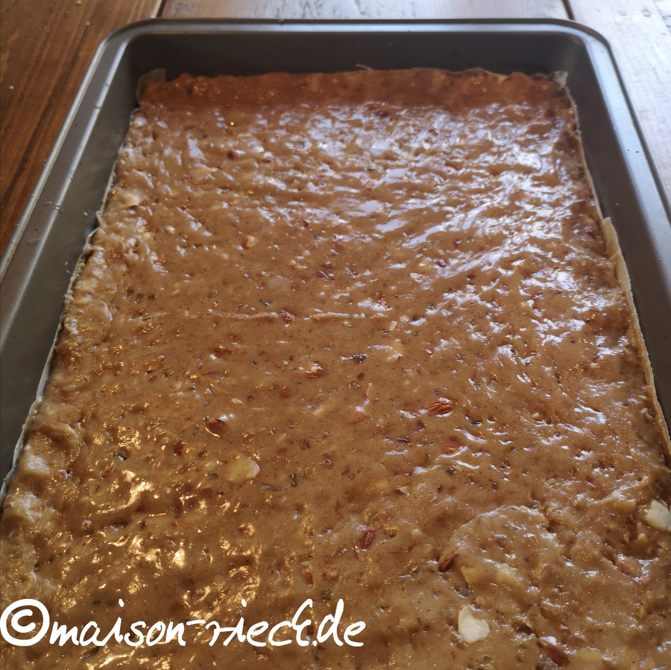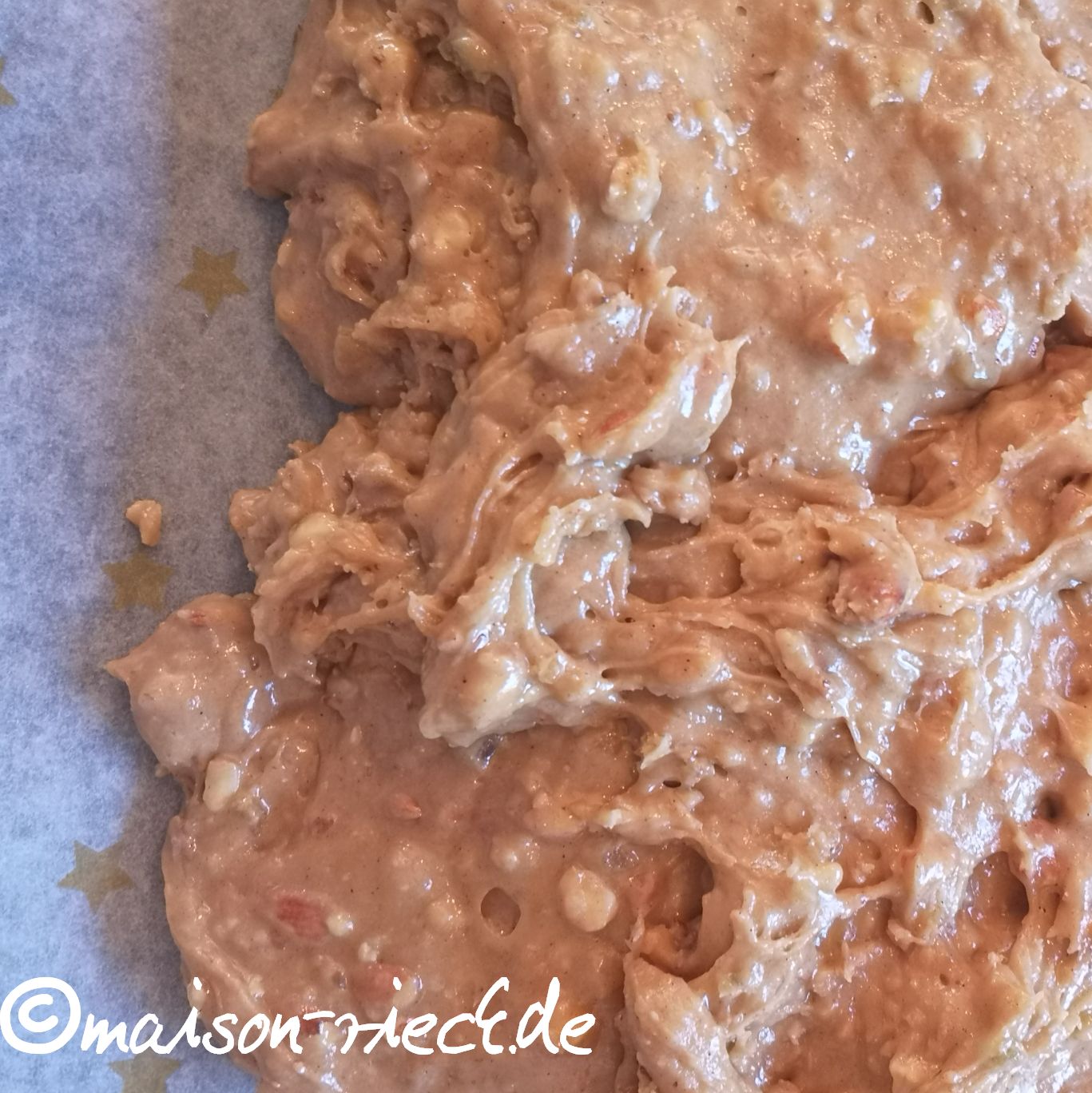 Den noch warmen (!) Teig auf ein mit Backpapier ausgelegtes Backblech geben. Mit feuchten Händen den Teig zu einer gleichmäßigen Platte auf das Backblech drücken.