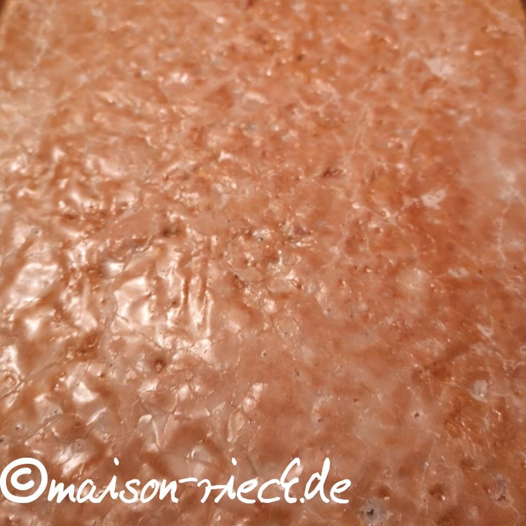 Den Puderzucker mit Kirschwasser oder Wasser glattrühren und sofort mit einem Backpinsel auf der noch heißen Oberfläche der Teigplatte verteilen Anschließend abkühlen lassen und dann zuerst die harten Ränder abschneiden, dann in Vierecke schneiden (im Original sind es Quadrate, aber Rauten sehen ansprechender aus).