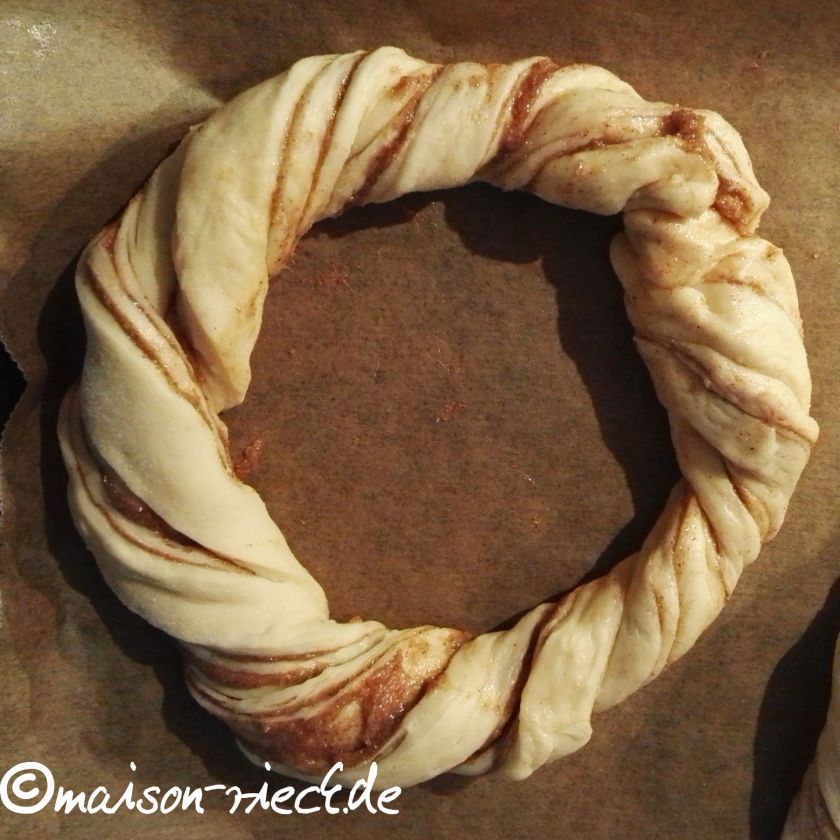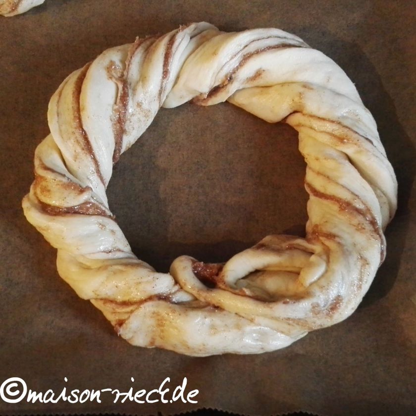 Die Streifen miteinander verdrehen und auf einem mit Backpapier ausgelegten Backblech zu einem Kranz legen. Die beiden Enden zusammendrücken. Den Kranz mit einem sauberen Tuch zugedeckt noch ca. 20 min gehen lassen.