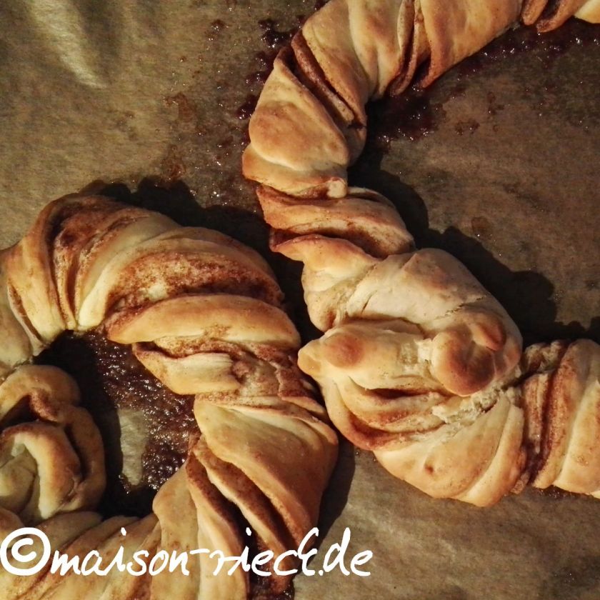 Zimtknoten oder Kanelknuter werden unterm Jahr meist als Kleingebäck hergestellt, als großer Kranz schmecken sie aber nicht minder gut. Wer dem Neujahrskranz einen dreifachen Segen für Glück, Gesundheit und Kraft mitgeben möchte, mischt das Mehl zu gleichen Teilen aus drei verschiedenen Mehlsorten.