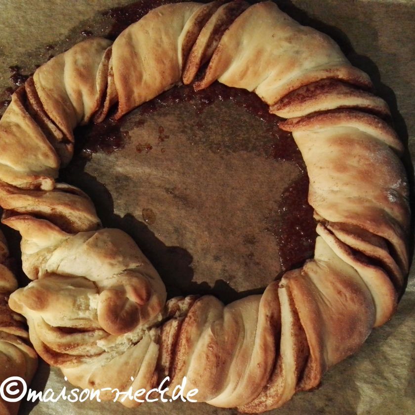 In der Zwischenzeit den Backofen auf 200 °C aufheizen. Den Zimtknoten-Kranz 20 – 25 min backen, bis er leicht gebräunt ist.