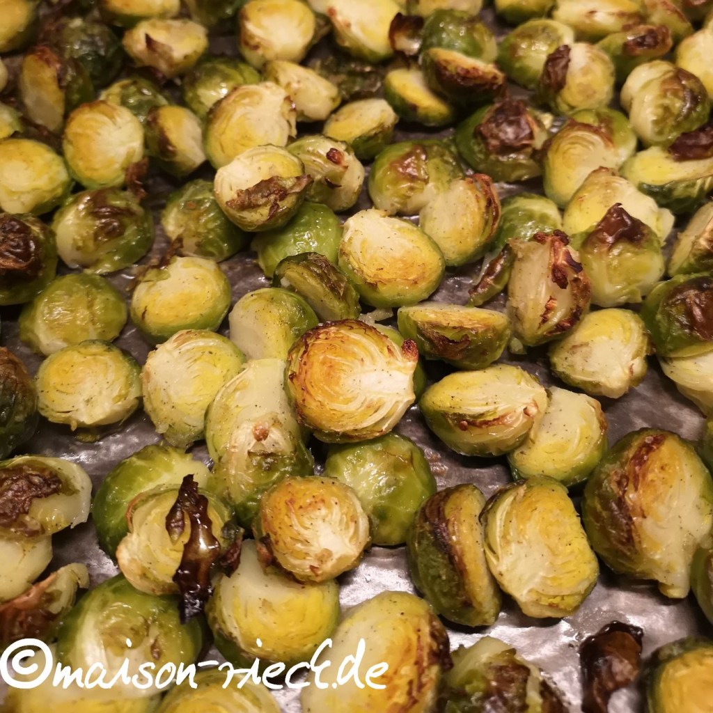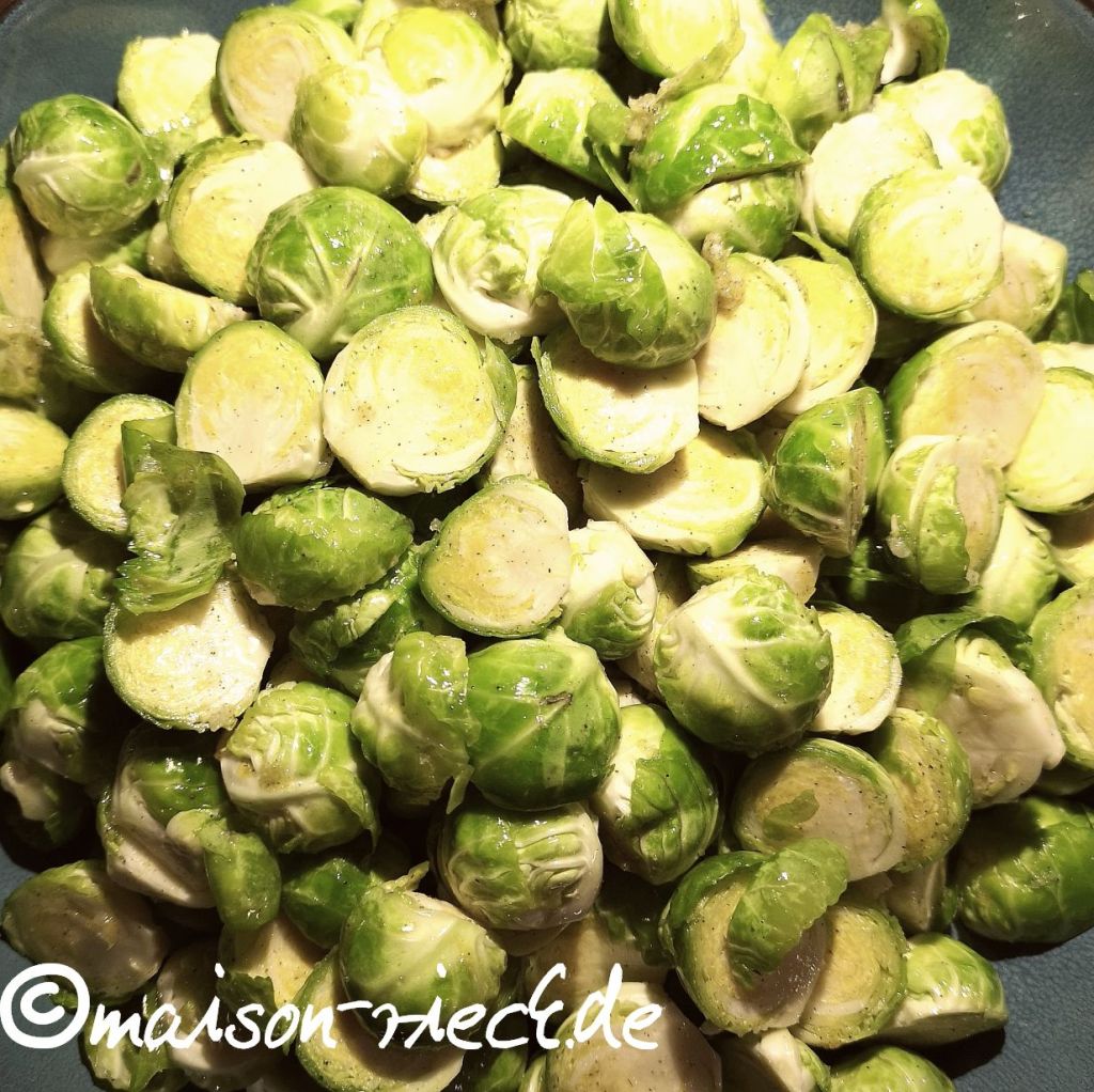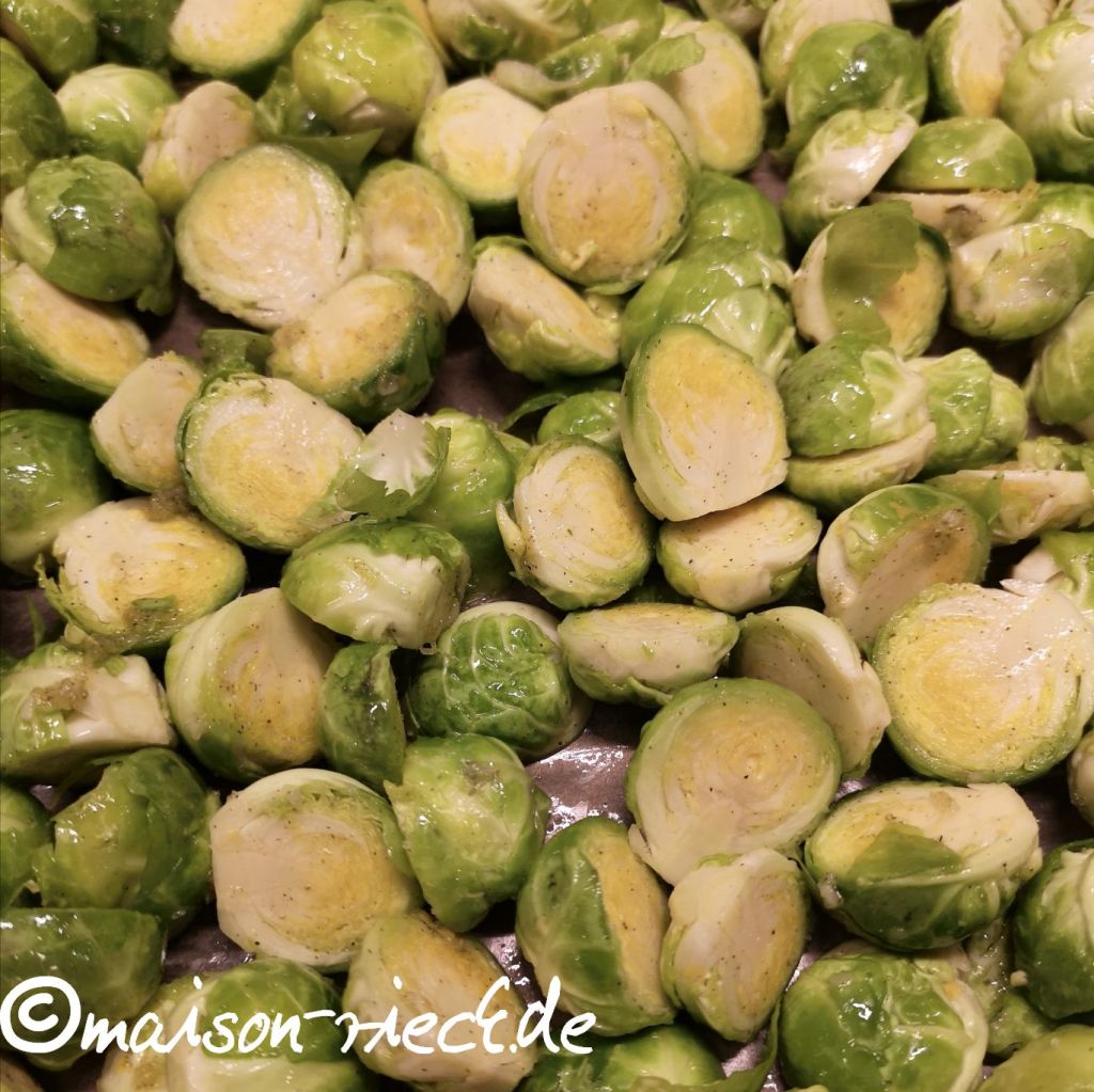Den Rosenkohl im Backofen bei 185°C 15 bis 20 min überbacken, bis er braune Stellen bekommt. Ggf. kurz die Grillfunktion mit einschalten.
