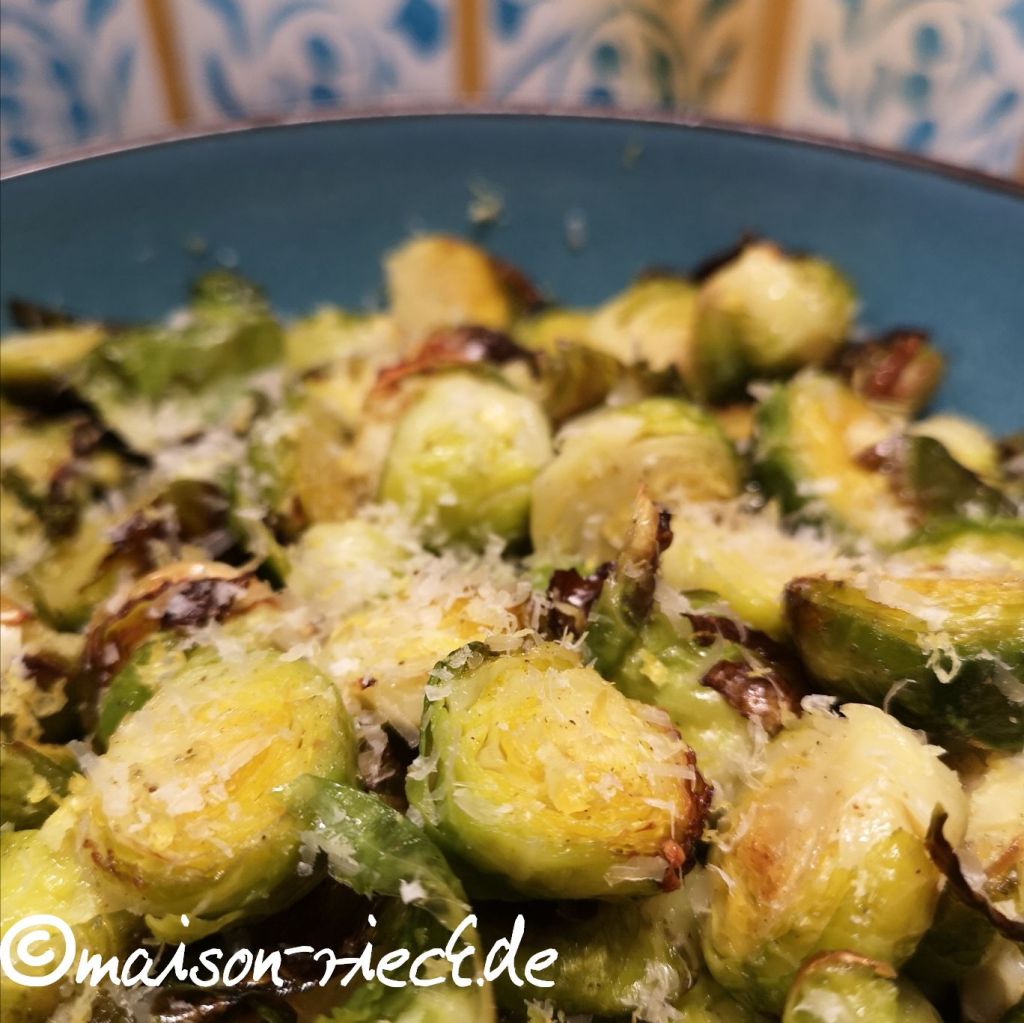 Den geriebenen Parmesan über den Rosenkohl streuen und kurz für 2-3 min gratinieren. Für eine vegane Variante den Parmesan-Käse weglassen oder durch geriebene Mandeln ersetzen.