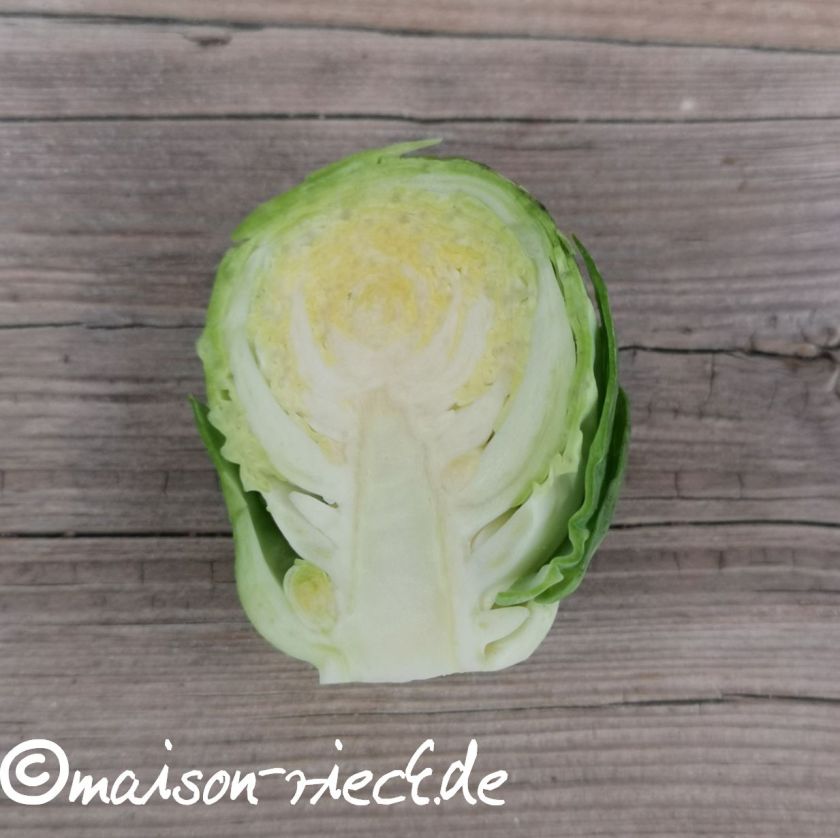Die Rosenkohl-Röschen putzen, indem man den Strunk-Ansatz abschneidet und die äußeren Blätter entfernt. Die Röschen längs halbieren.