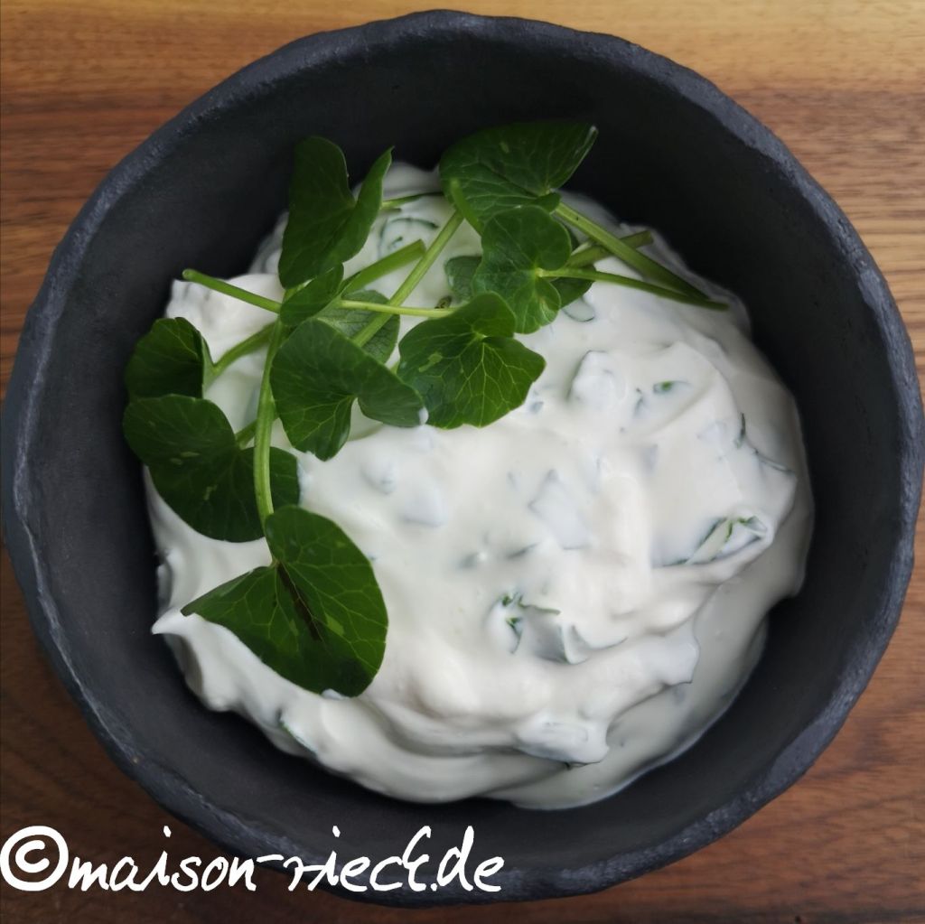 Die Scharbockskraut-Blätter waschen und grob hacken. Mit dem Schmand mischen und den Dip mit Salz abschmecken.
