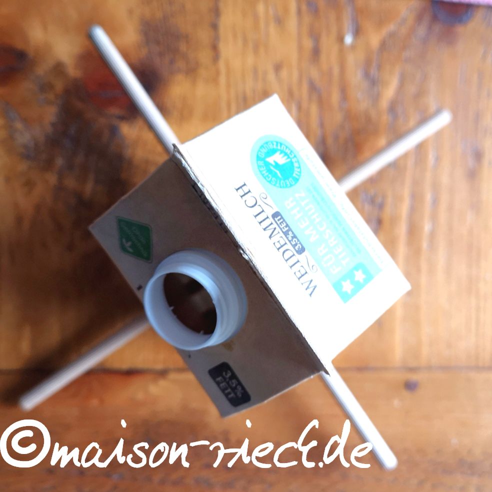 Die Stäbe werden durch die Löcher geschoben und kreuzen sich im Inneren des Tetrapaks. Deshalb müssen die Löcher für einen Stab etwas höher sein als für den anderen.