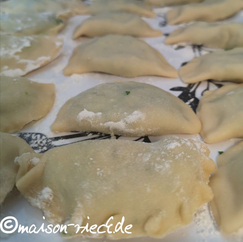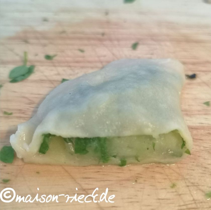 Den Teig auf Mehl dünn ausrollen und mit einem großen bemehlten Glas Kreise mit einem Durchmesser von 8-10 cm ausstechen. Ca. 1 TL der Kartoffelmasse in die Mitte eines Kreises geben, in der Mitte zusammenklappen und die Ränder mit den Fingern fest zusammendrücken.