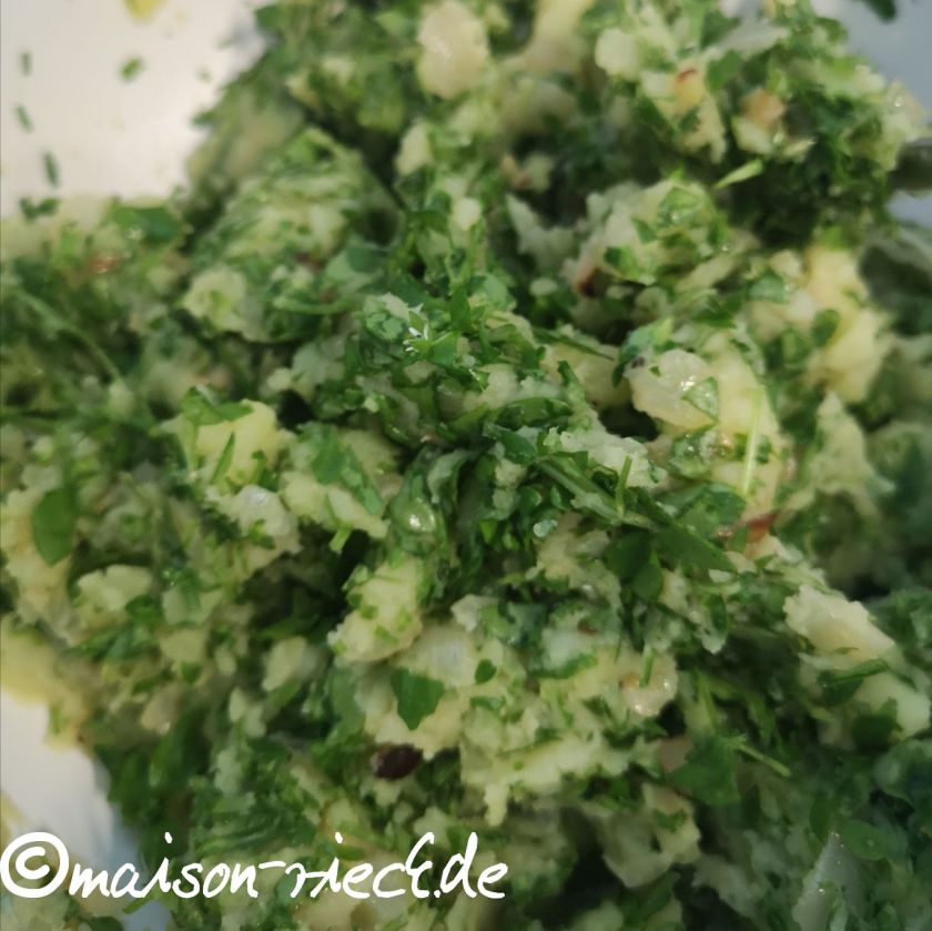 Die Vogelmiere verlesen, waschen und fein hacken. Zusammen mit Salz und Muskat unter die Kartoffelmasse geben und abschmecken.