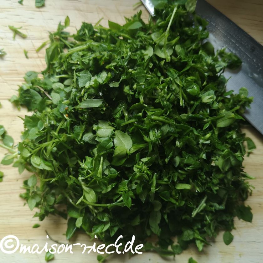 Die Pflanze ist zwar klein, sie wird meist nur 15 cm hoch, aber ihre Blätter sind fleischig und knackig. Details zur Bestimmung der Vogelmiere sind im Beitrag Vogelmiere-Crêpe zu finden.