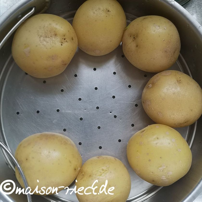Die Kartoffeln als Pellkartoffeln weich kochen. Anschließend schälen und durch eine Kartoffelpresse fein zerdrücken
