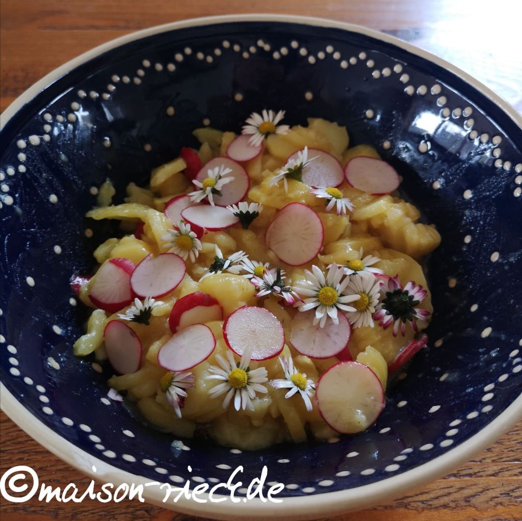 Ein Gedanke zu „Schwäbischer Kartoffelsalat mit Radieschen und Gänseblümchen“