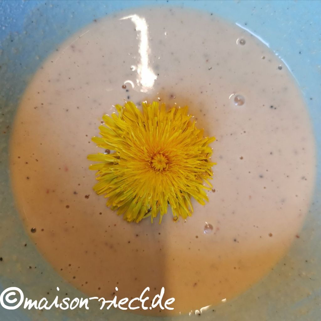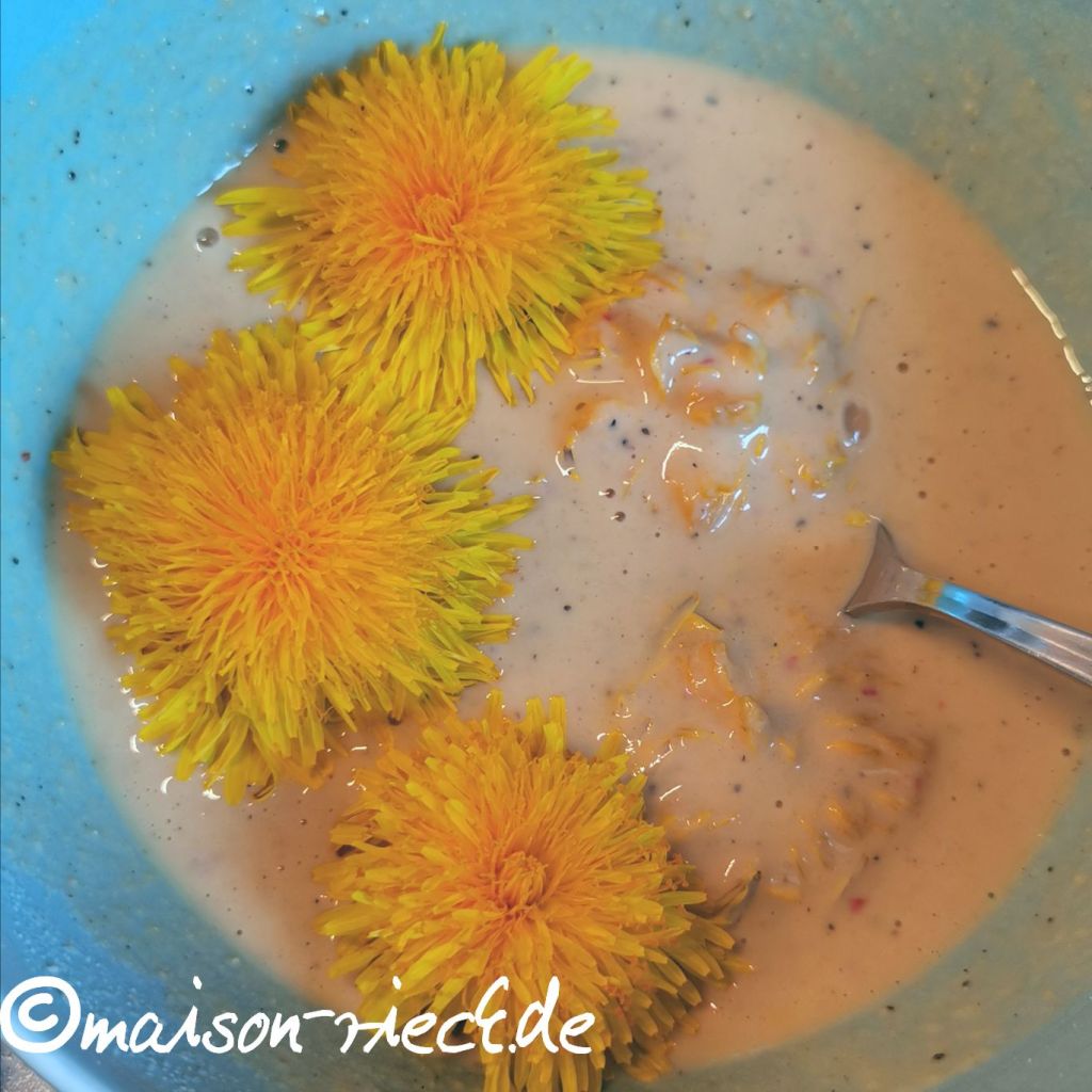 Für die herzhaften Küchle ebenfalls alle Zutaten für den Teig zusammen glattrühren, die Löwenzahnblüten hineintauchen und in einer beschichteten Pfanne in Pflanzenfett ausbacken. Zu den herzhaften Löwenzahnblüten-Küchle passt ein Dip aus Joghurt, Salz und nach Belieben auch Knoblauch. Die süßen Küchle können mit flüssigem Honig, Löwenzahnblüten-Honig oder -Sirup übergossen werden.