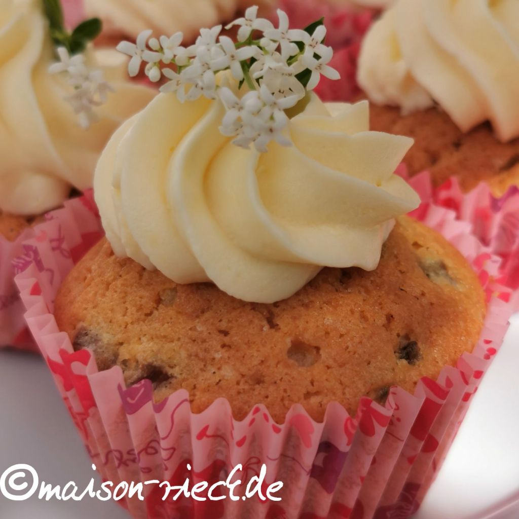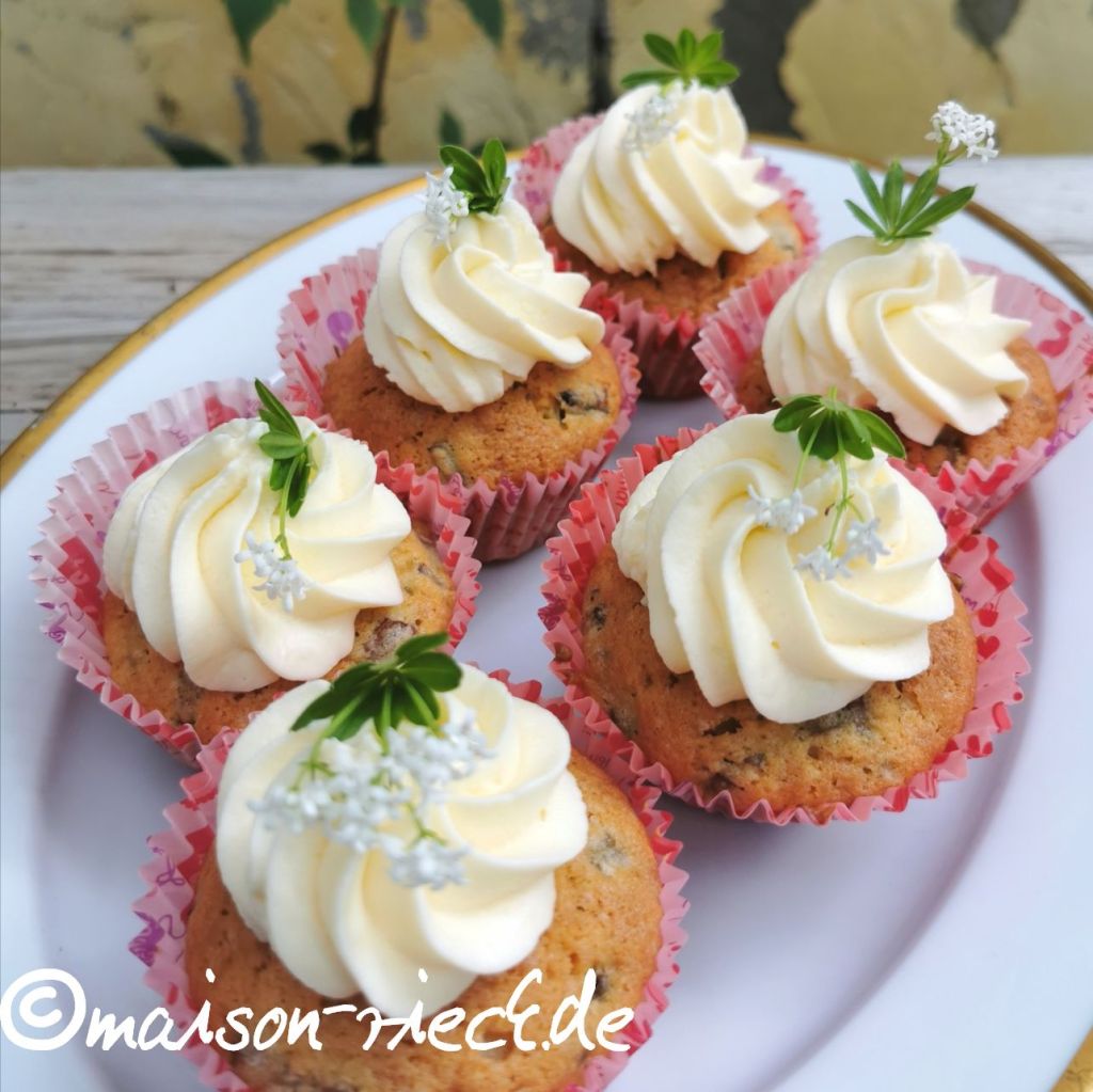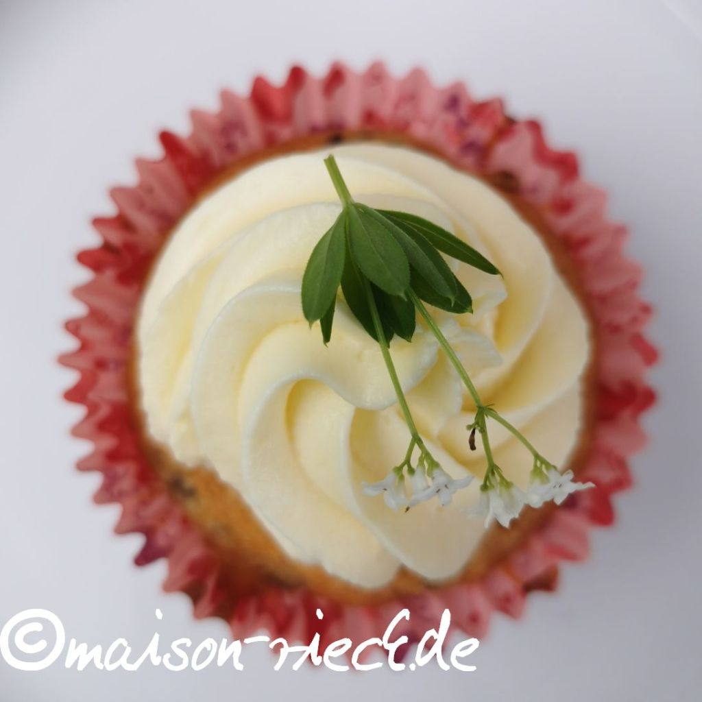 Natürlich schmecken die Cupcakes auch mit Rhabarber oder Heidelbeeren sehr gut! Der Waldmeister-Sirup im Frosting kann auch mit Holunderblüten-Sirup, einem anderen Sirup oder auch mit flüssigem Honig ersetzt werden.