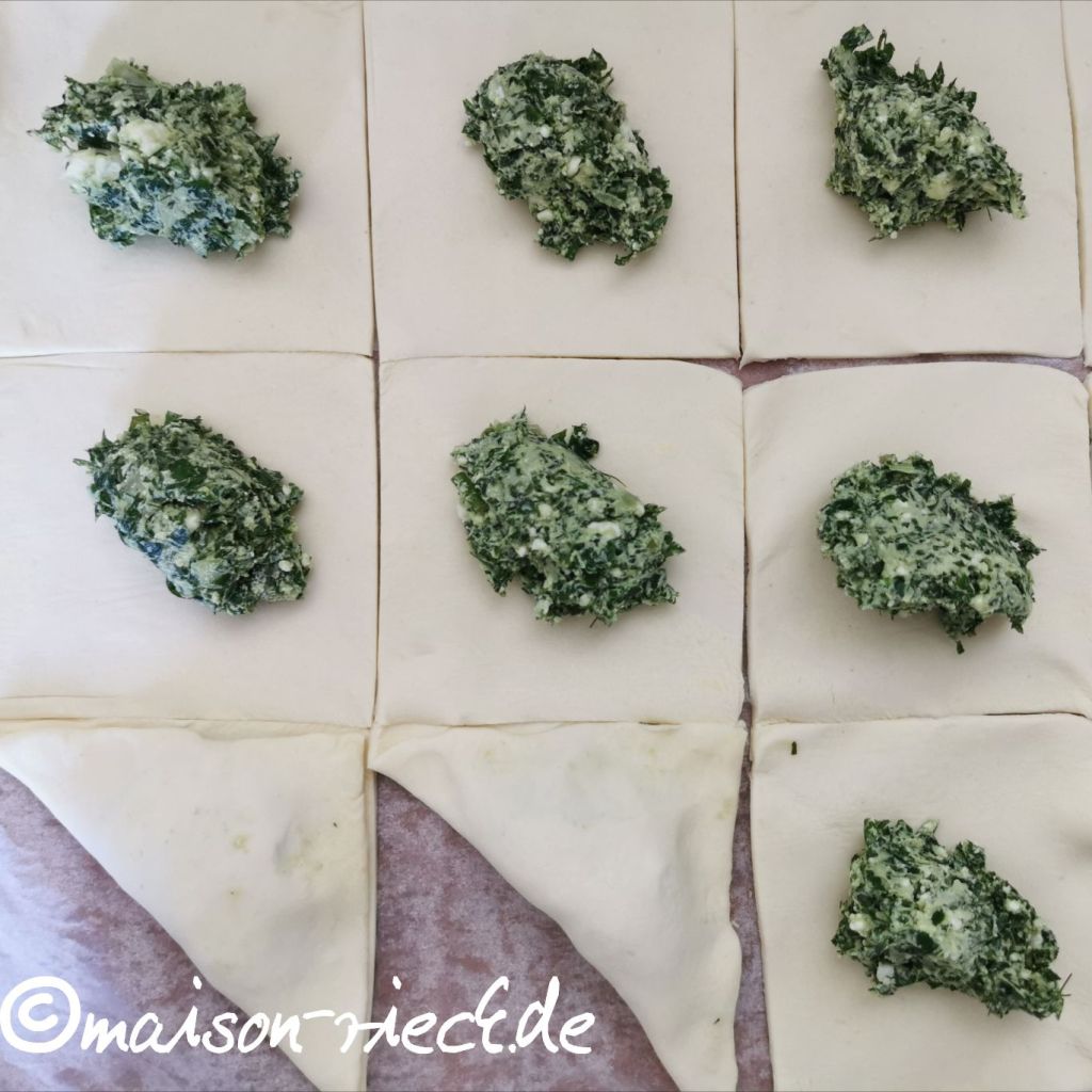 Den Blätterteig ausbreiten und in Quadrate von 12 x12 cm schneiden. Auf jedes Quadrat einen Löffel der Wildkräuter-Feta-Mischung geben. Den Teig über der Füllung zu einem Dreieck zusammenklappen und die Ränder mit den Zinken einer Gabel gut zusammendrücken.