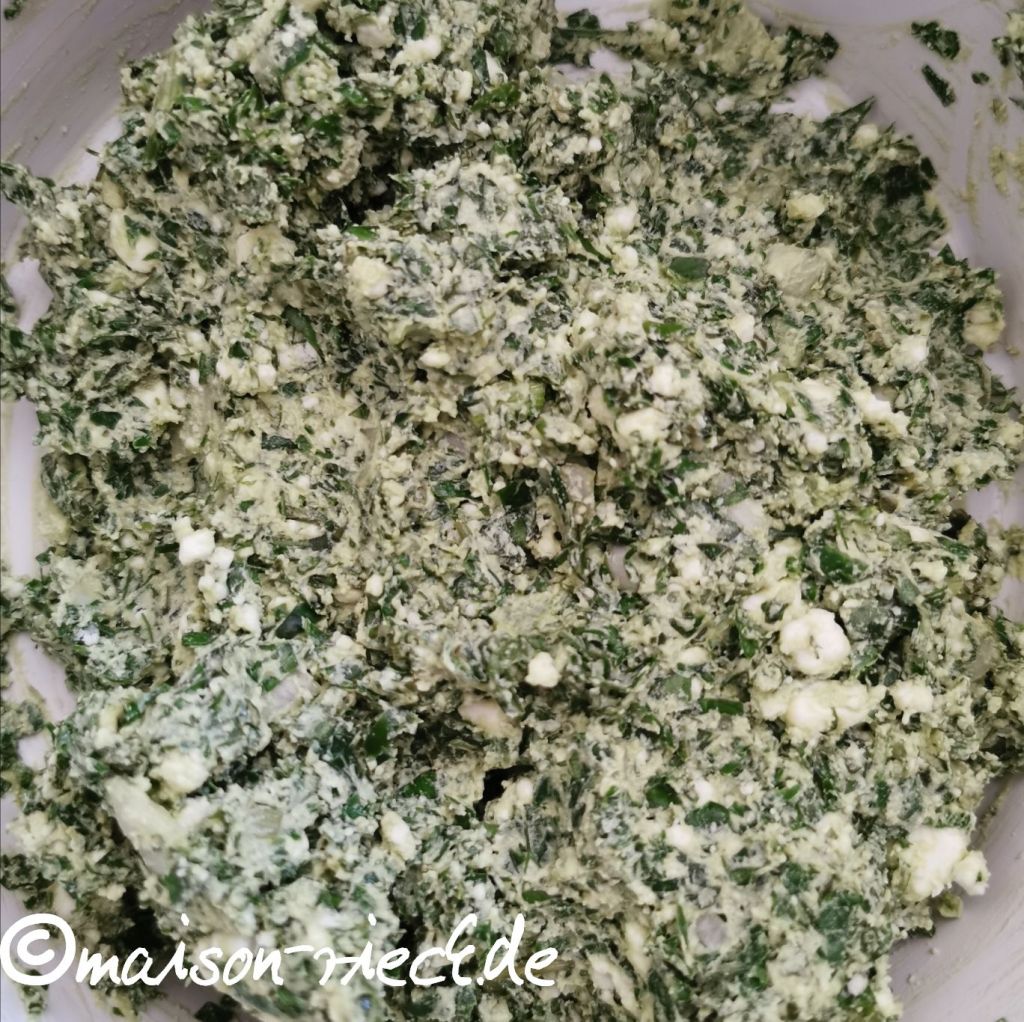 Die Wildkräuter waschen und fein hacken. Den Feta zerkrümeln und mit den Wildkräutern mischen, ein wenig salzen (nicht zu viel, weil der Feta bereits salzig ist).