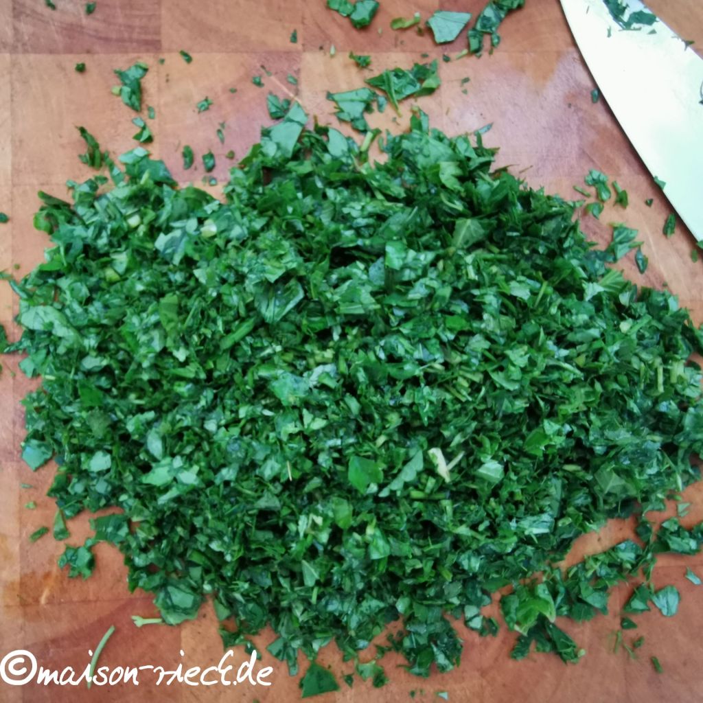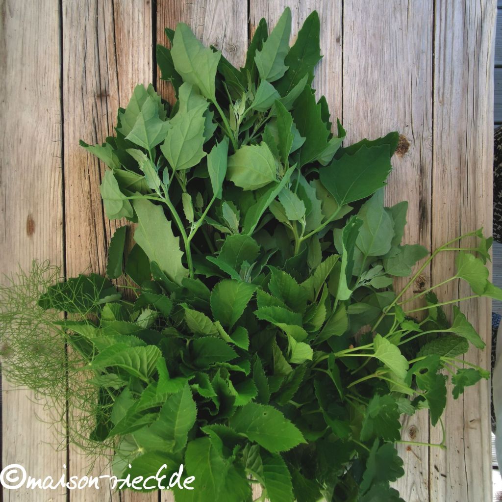 100g Wildkräuter mit großen Blättern (Gänsefuß, Giersch, Brennnesseln…) oder Spinat
