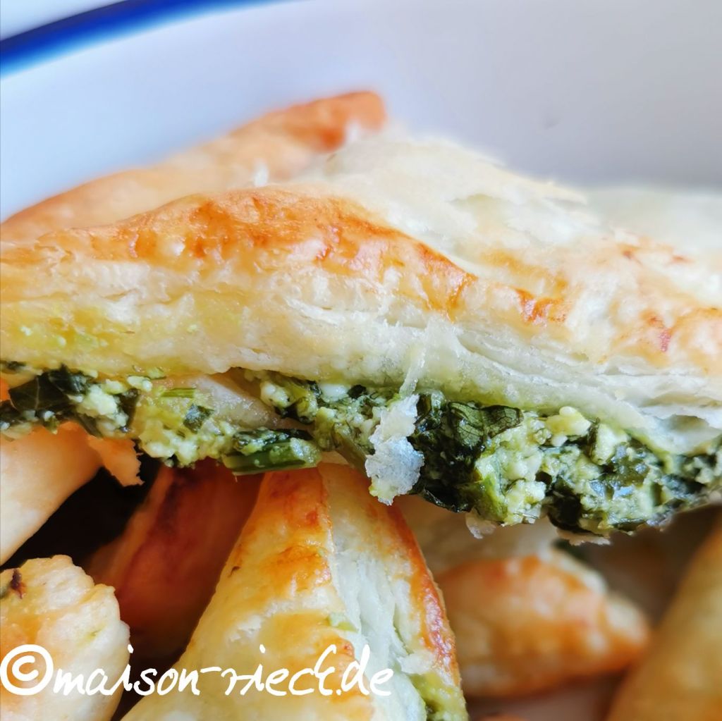 Die Blätterteig-Taschen schmecken warm oder kalt. Sie können auch gut eingefroren werden.