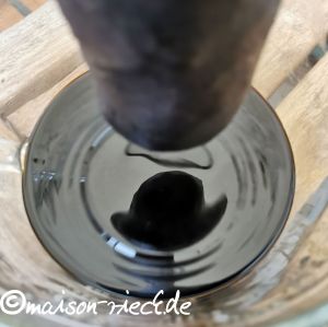 Die fertige Tinte nochmals erhitzen und heiß in möglichst kleine Gläser mit Schraubdeckel abfüllen. Um die Haltbarkeit der Tinte zu verbessern, können ihr noch ein paar Tropfen Nelkenöl zugefügt werden (oder eine Gewürznelke pro Glas hinein gegeben).