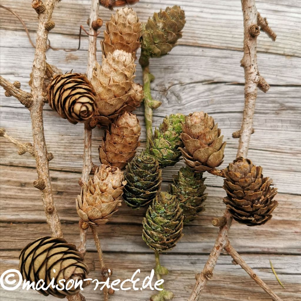 Wenn man die eiförmigen Lärchen-Zapfen allerdings nicht vom Baum abschneidet, sondern die heruntergefallenen Zweige sammelt, erhält man ein schöne Vielfalt an Farben und Formen. Je älter die Zapfen sind, desto weiter sind die Schuppen geöffnet und die Farbe verändert sich von einem warmen hellbraun zu einem Treibholz-Grau. Lagen die Zweige längere Zeit auf dem Waldboden, sind sie manchmal von Flechten bewachsen und schimmern kupfergrün.