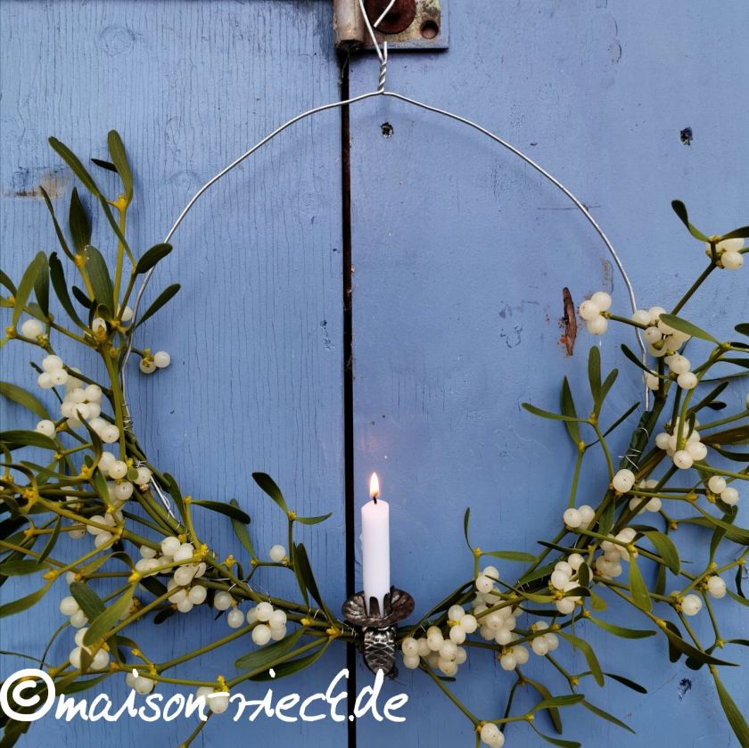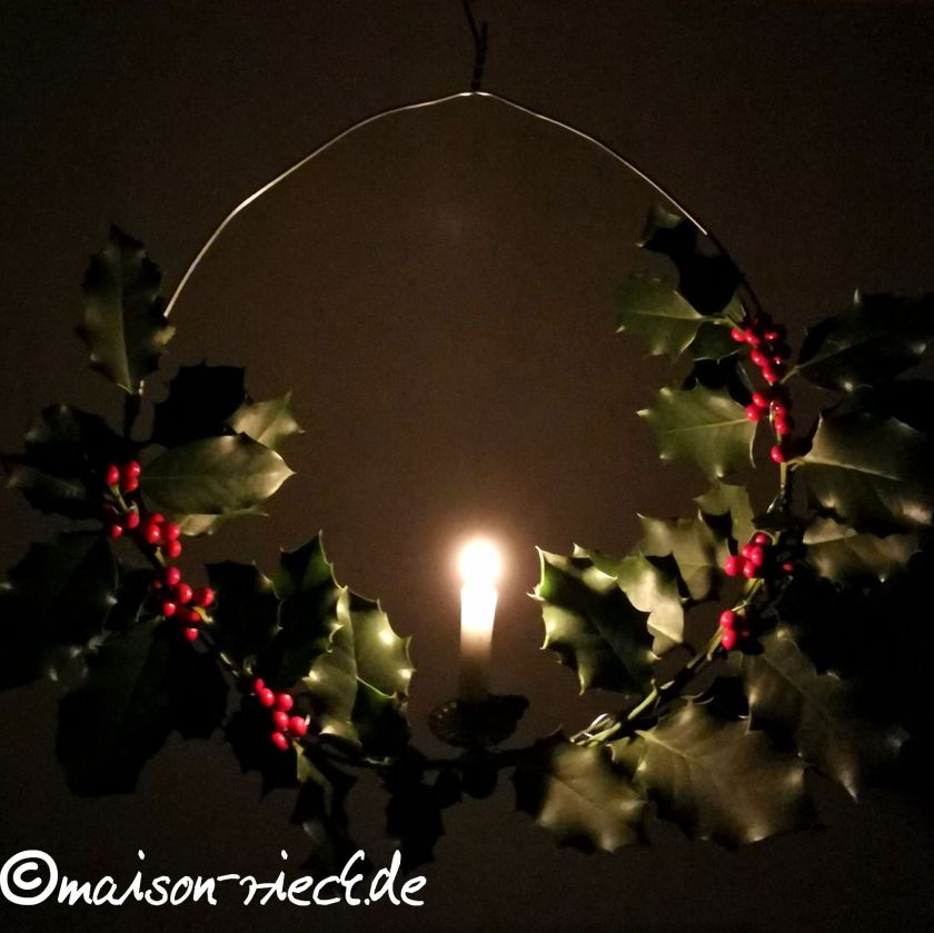 Ein einfacher Kranz aus Mistel- oder Ilex-Zweigen ist eine schlichte Schönheit. Das Grundgerüst für den Kranz, der aufgehängt und mit einer Kerze dekoriert werden kann, ist ein Draht-Kleiderbügel, der auf diese Weise ein Upcycling erhält.