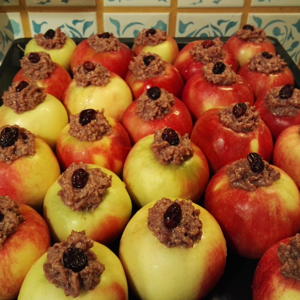 Die Füllung ist schnell hergestellt: gemahlene Nüsse und Mandeln werden mit einer Wildfrucht-Konfitüre gemischt und in die ausgehöhlten Äpfel gefüllt. Besonders gut geeignet sind Konfitüren oder Gelees von Holunderbeeren Brombeeren, Weißdorn, Schlehen, Hagebutten, Quitten, Aronia- und Sanddorn-Früchten. Auch fertige Wild-Preiselbeeren- oder Heidelbeeren-Konfitüren sind eine sehr gute Kombinationsmöglichkeit. Einen weihnachtlichen Hauch bekommen die Bratäpfel durch Zimt und Kardamom. Mit einer Vanillesoße serviert sind die Bratäpfel eine rustikale Delikatesse.