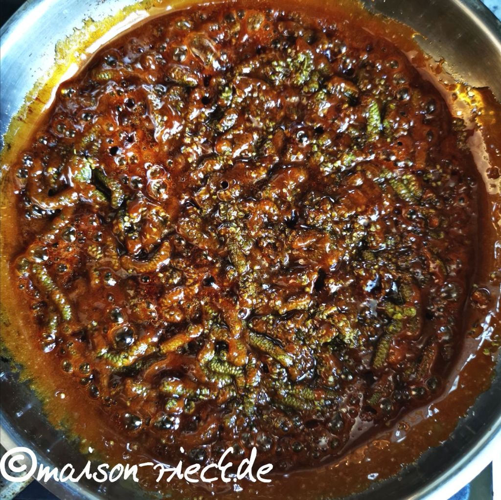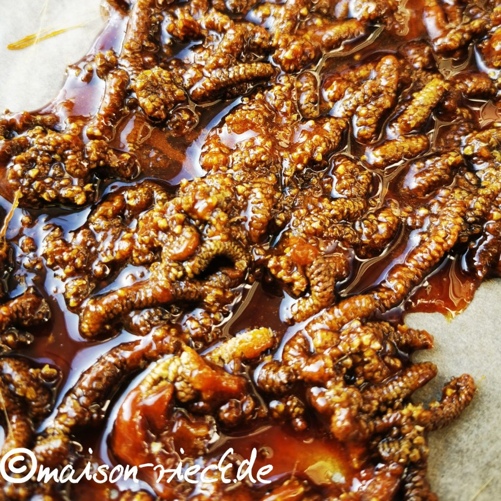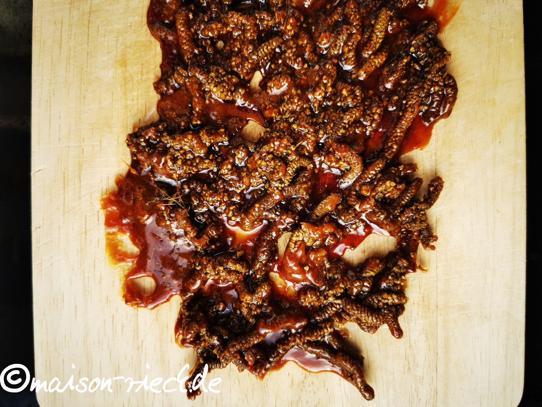 Um die Haselkätzchen in eine kleine kulinarische Leckerei zu verwandeln kann man sie zum Beispiel karamellisieren und entweder zu Joghurt essen (Karamellisierte Haselkätzchen) oder zusammen mit getrockneten Früchten Schokolade damit aufpeppen: