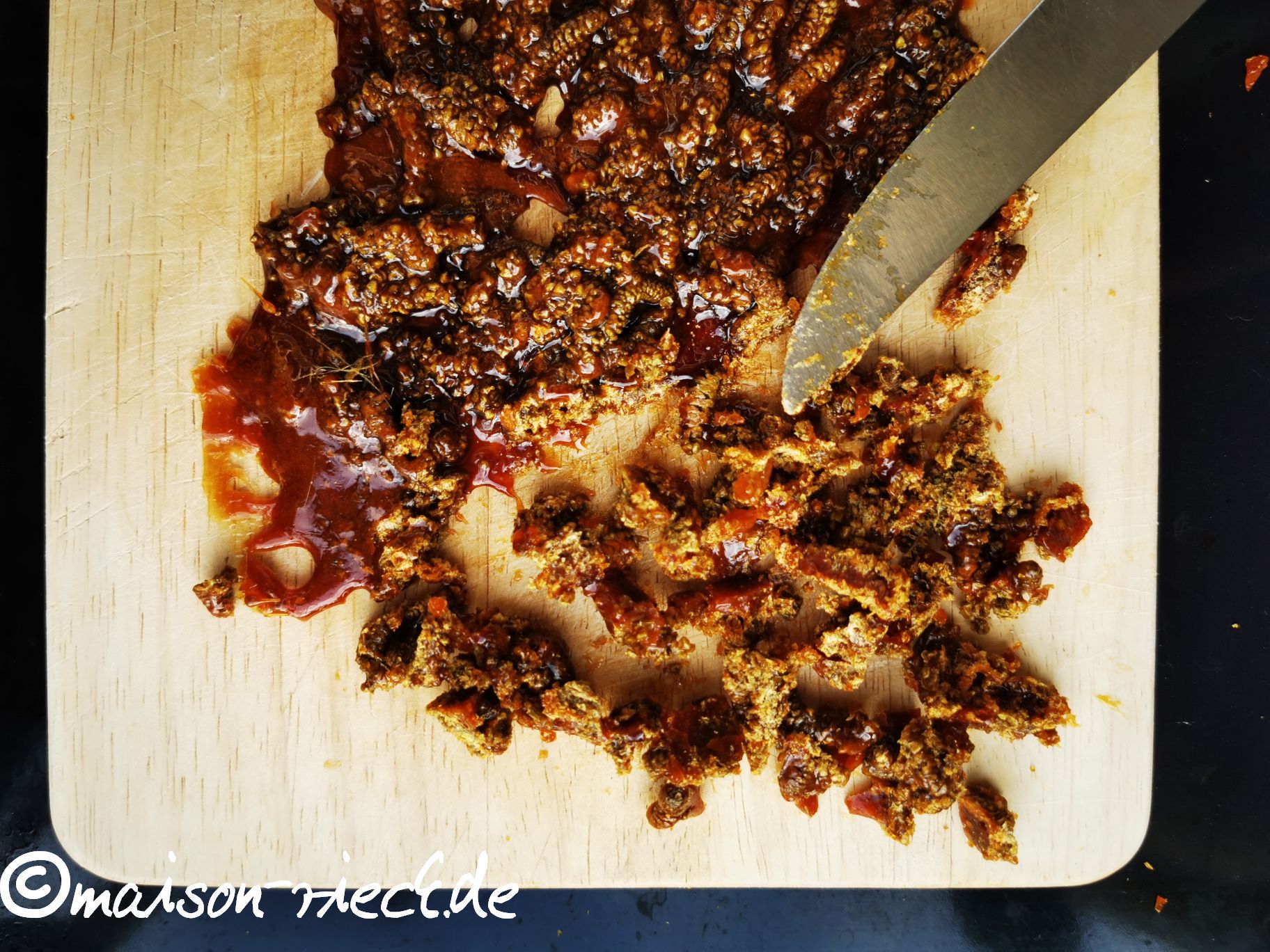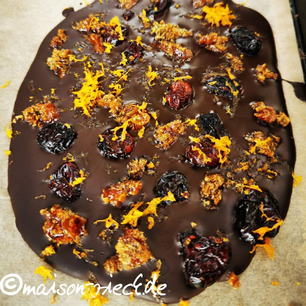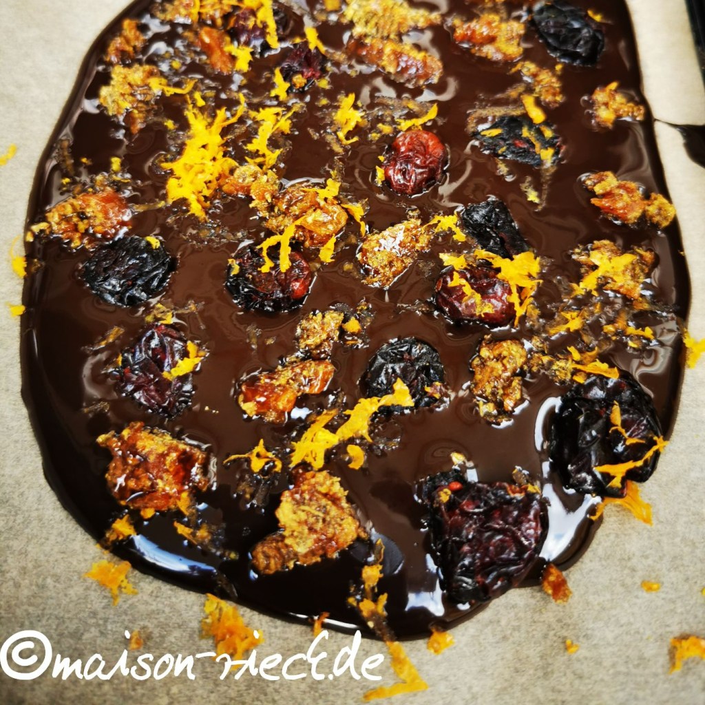 Die geschmolzene Schokolade auf ein weiteres, mit Backpapier ausgelegtes Backblech gießen. Sofort den gehackten Haselkätzchen-Karamell, die Trockenfrüchte und ein paar Zesten der Bio-Orangenschale darauf verteilen.