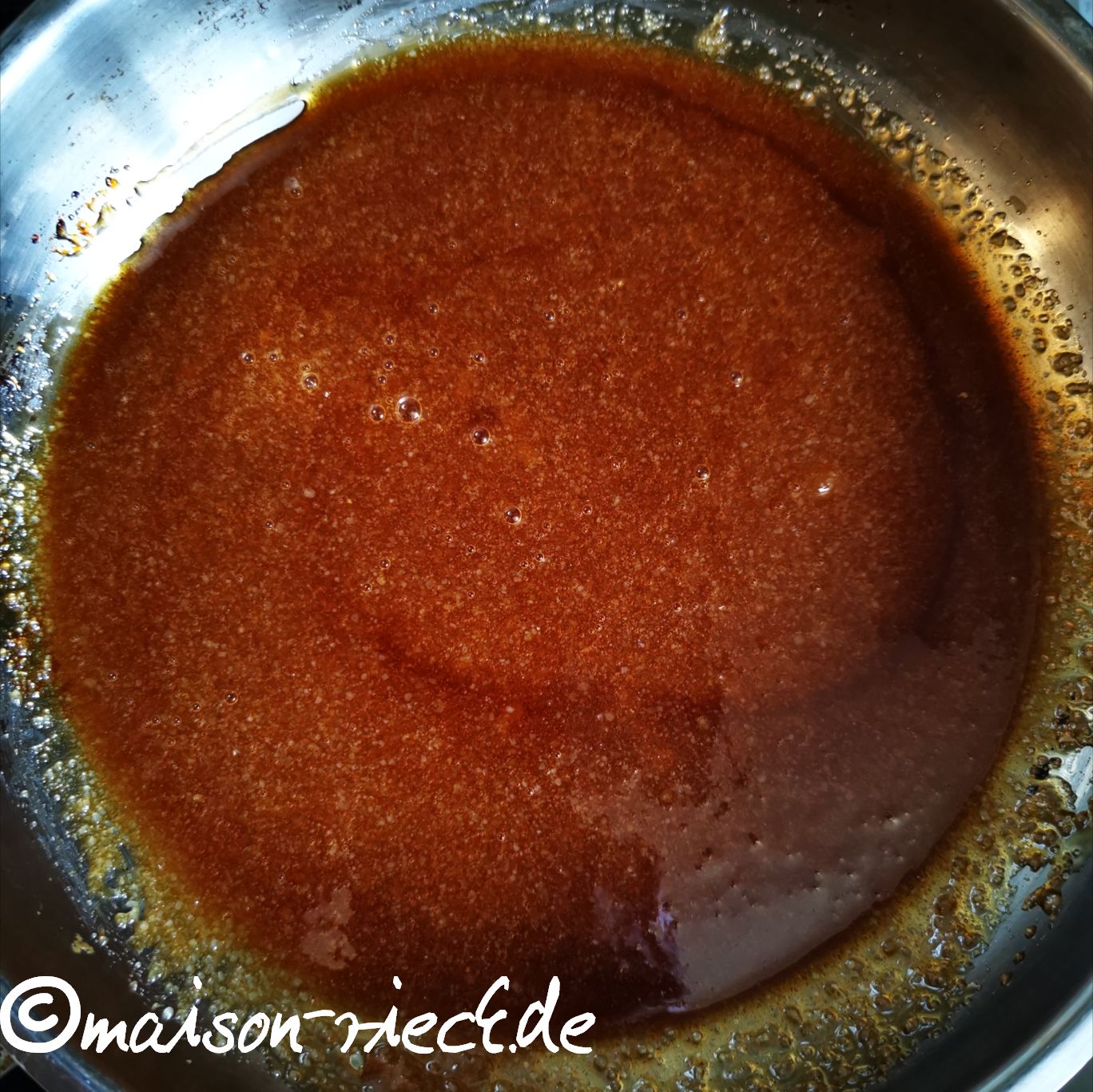 Die Schokolade in einem kleinen Topf im Wasserbad (oder in einem doppelwandigen Simmertopf) schmelzen. In der Zwischenzeit den Haselkätzchen-Karamell mit einem Messer in kleine Stücke hacken.